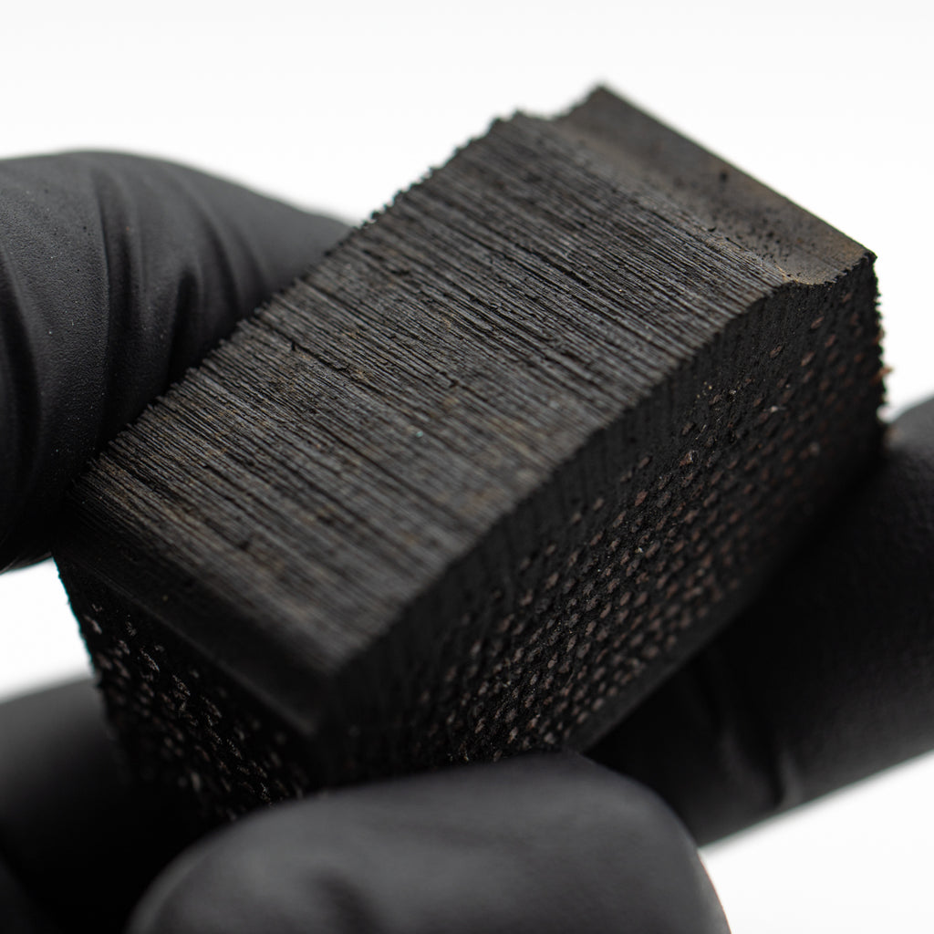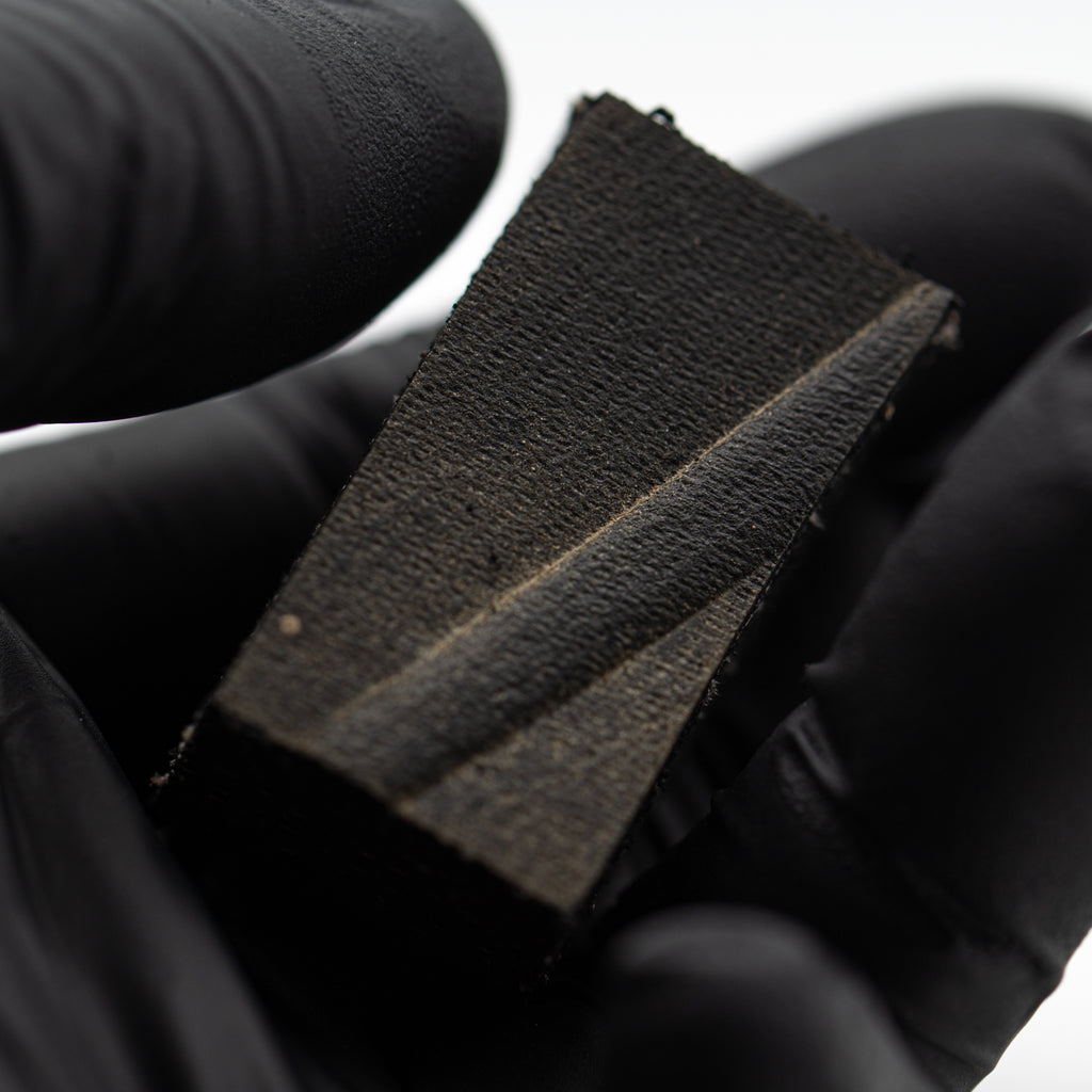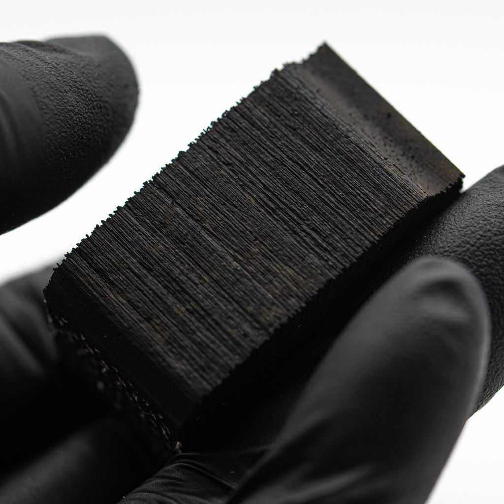 This specimen is a 1.448" mission-flown nose landing gear tire fragment from the Space Shuttle Columbia (OV-102). Serial number verification against public information indicates the tire was removed from service after Columbia's 13th mission (STS-52). This piece includes skid marks from the touchdown of the Space Shuttle during landing.