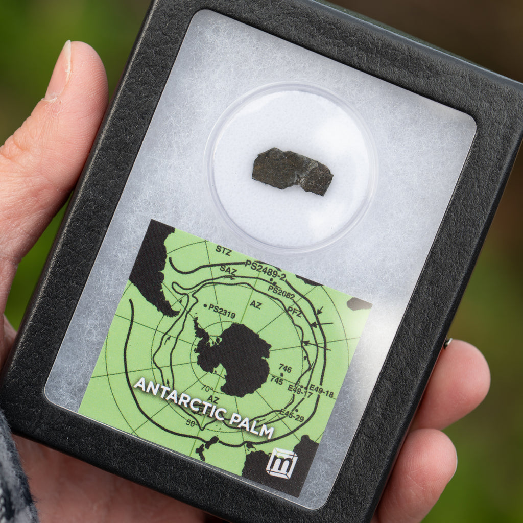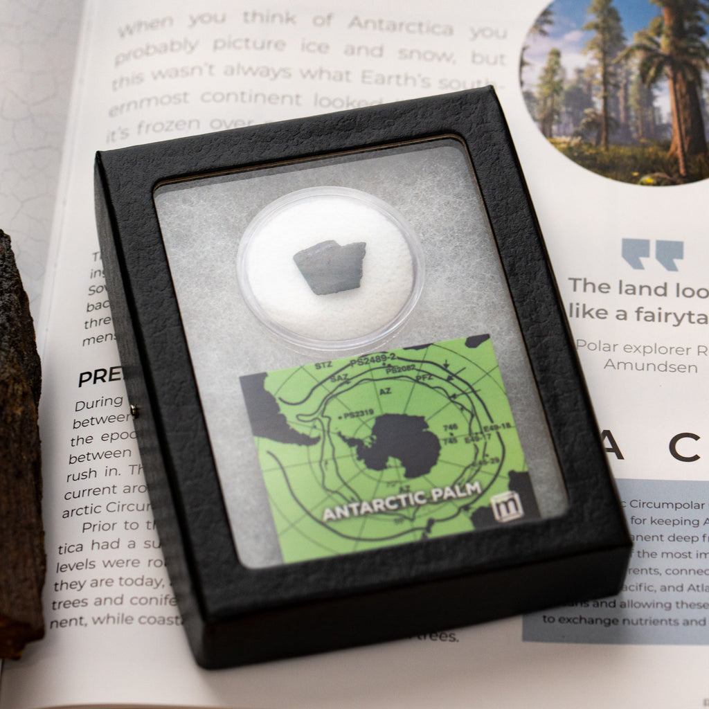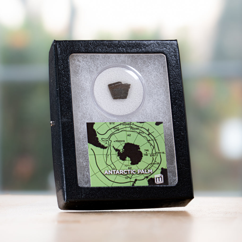 This specimen is a fossil palm tree fragment, uncovered during a Soviet expedition to the continent in 1986. It measures between 0.5-0.75" and ships in a handsome riker display case with an informational card that serves as statement of authenticity.