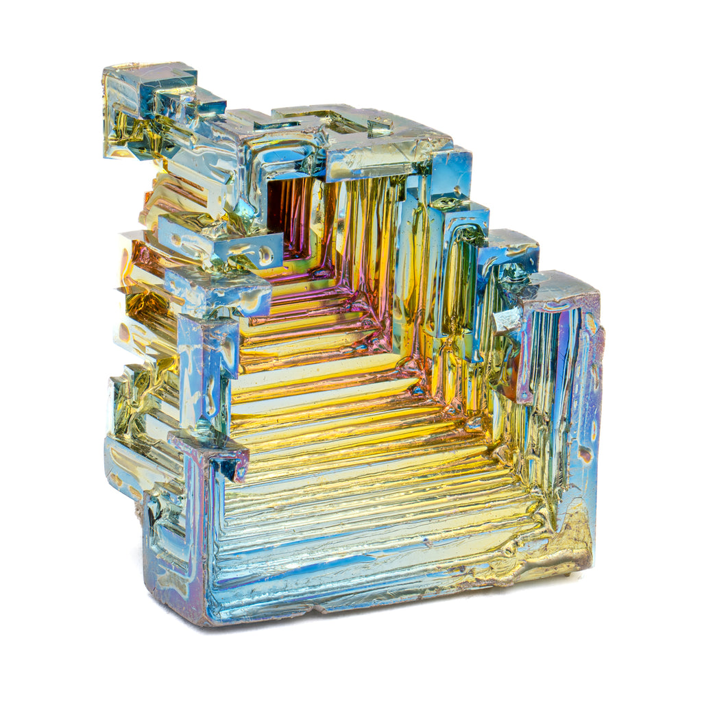Bismuth is an element (Bi 83) best known for its unusual staircase shape, the result of bismuth atoms attaching to the edge of a rapidly growing crystal. This is called hoppering, when atoms are drawn to the edge of a structure, creating a lattice formation.