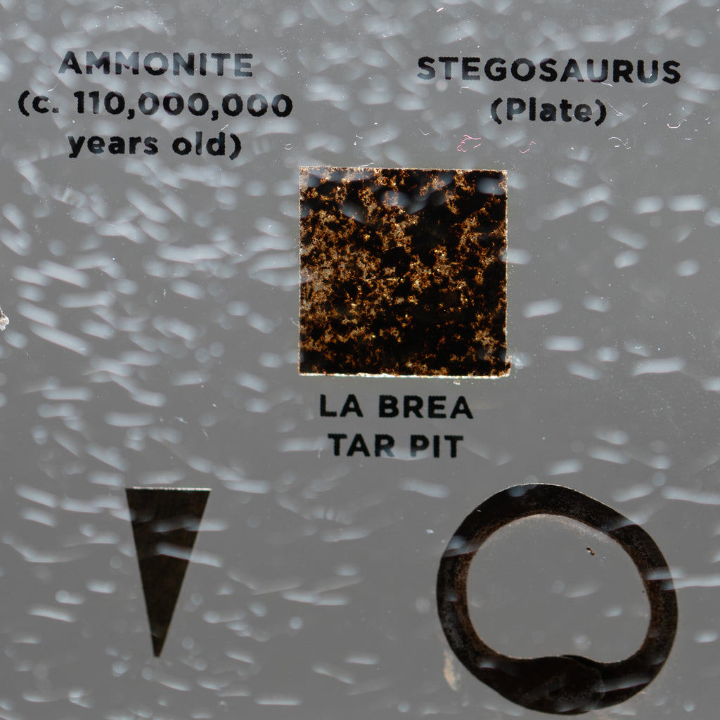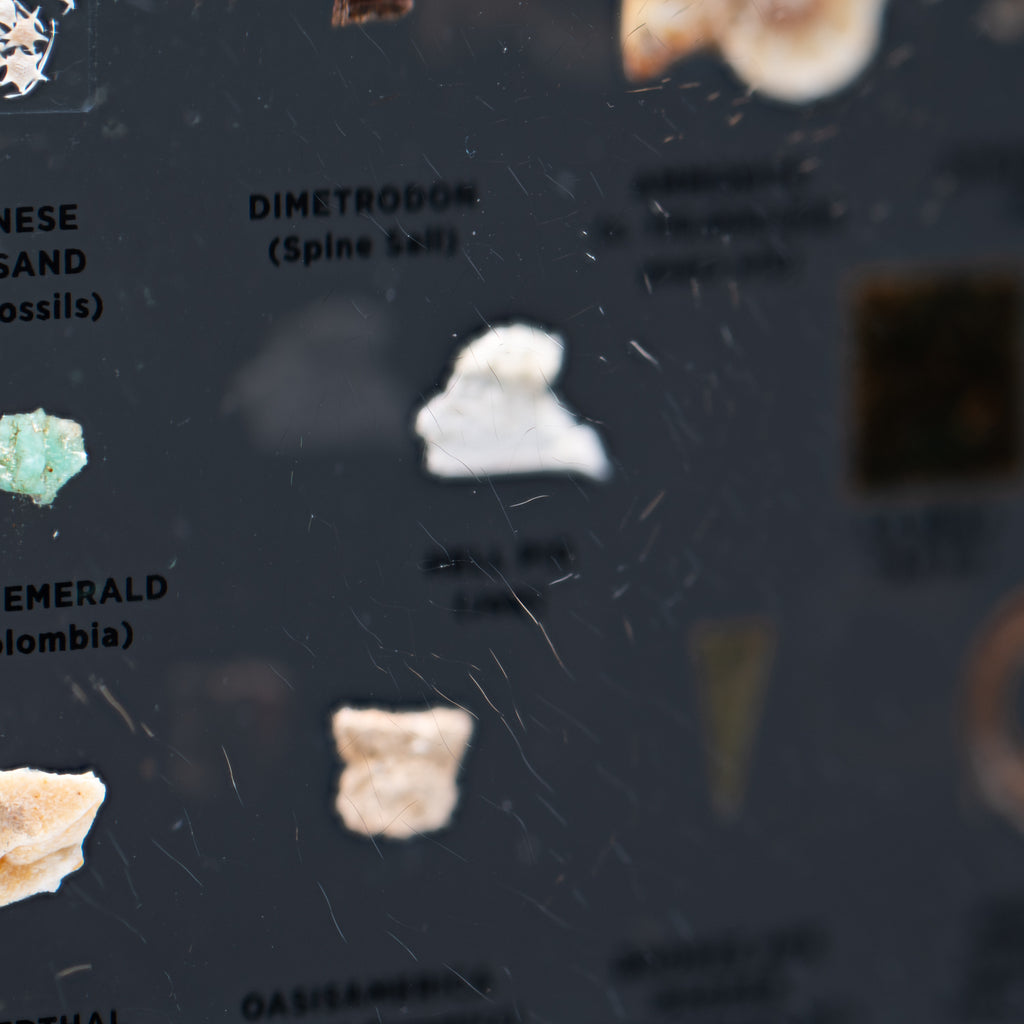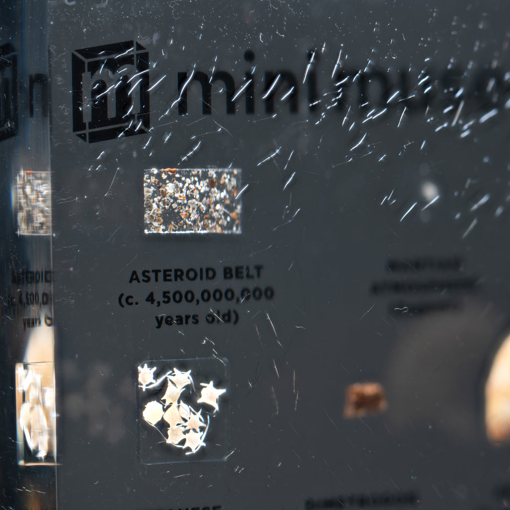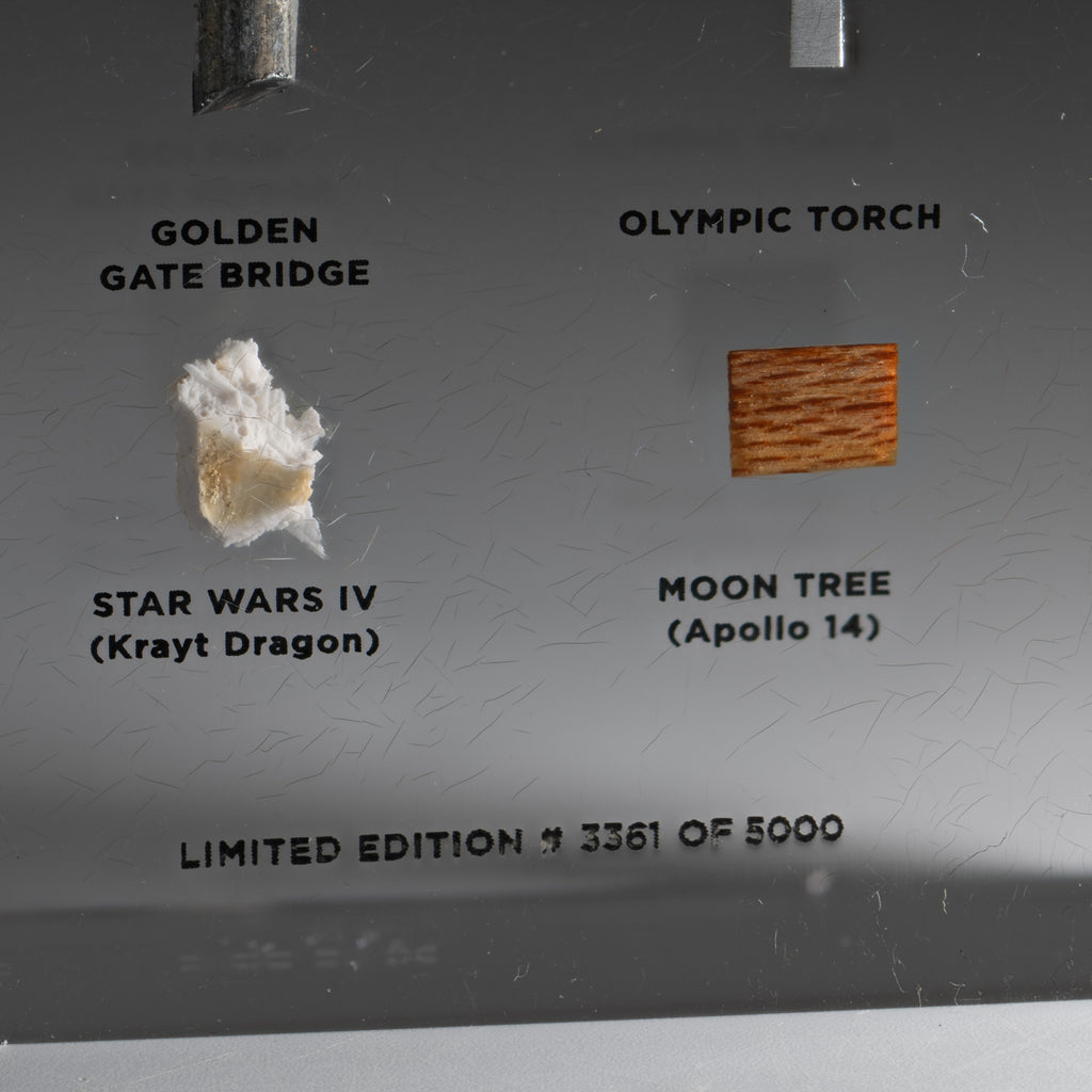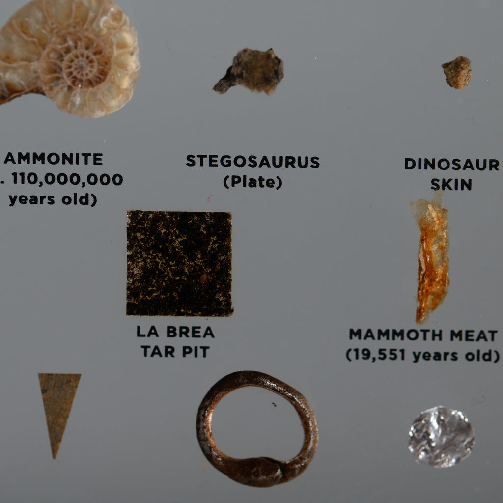 Asteroidengürtel (ca. 4.500.000.000 Jahre alt), Marsatmosphäre (Zagami-Meteorit), Libysches Wüstenglas (ca. 28.500.000 Jahre alt), Berg Fuji (Lava), Japanischer Sternensand (Foraminafera-Mikrofossilien), Dimetrodon-Rückensegel, Ammonit, Stegosaurus-Platte, Dinosaurierhaut, Rohsmaragd aus Kolumbien, Höllenschweinkiefer (Entelodont), La-Brea-Teergrube, Mammutfleisch (19.551 Jahre alt), Neandertaler-Faustkeil, Oasisamerica (antike Keramik), Dolch aus der Bronzezeit aus dem 12. Jahrhundert v. Chr., Mittelalterliches Kettenhemd aus dem 15. Jahrhundert n. Chr., Schiffswrack-Achterstücke, Versteinerter Blitz (Fulgurit), Hindenburg (Luftschiffhaut), Golden Gate Bridge, Olympische Fackel, Astronauten-Mixtape (Skylab, 1973), Der erste Supercomputer (Cray-1), Star Wars-Episode IV (Krayt-Drache), Mondbaum (Apollo 14)