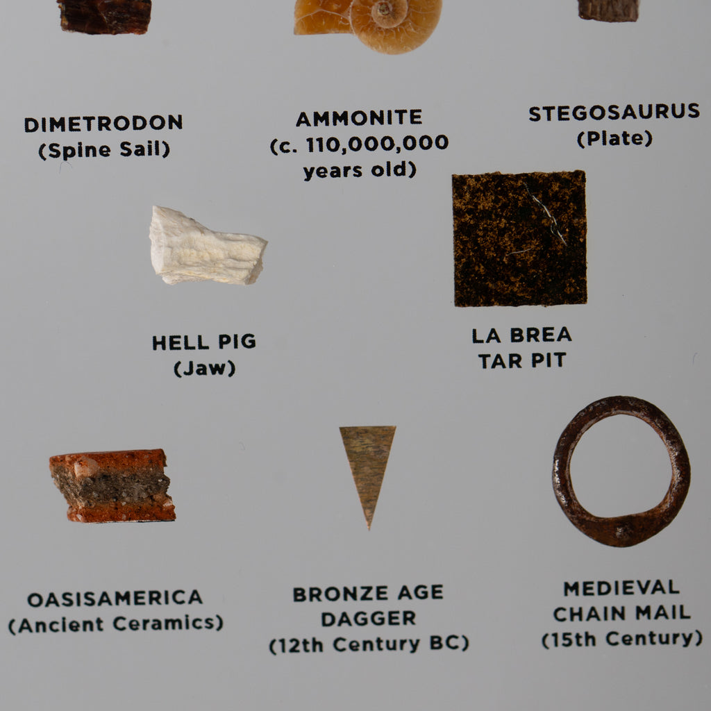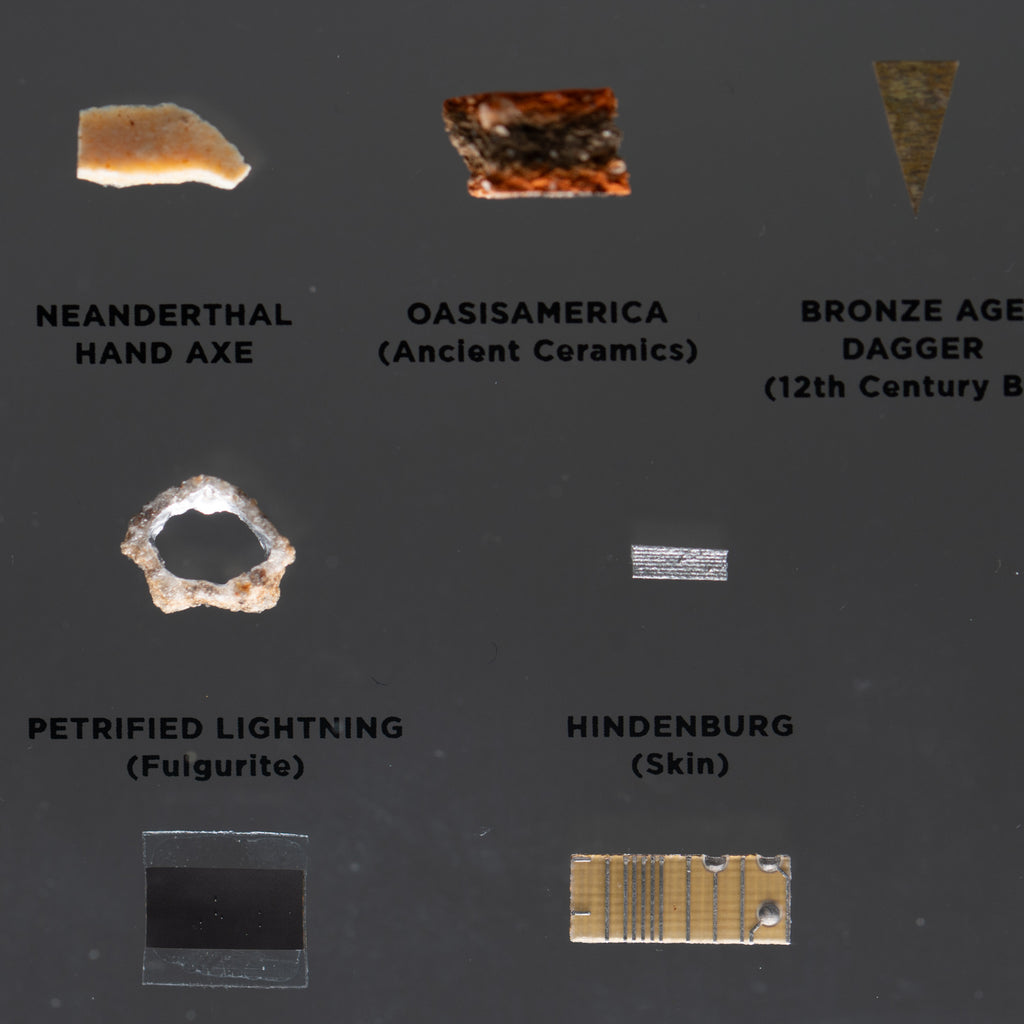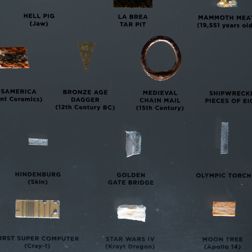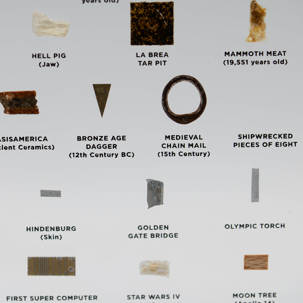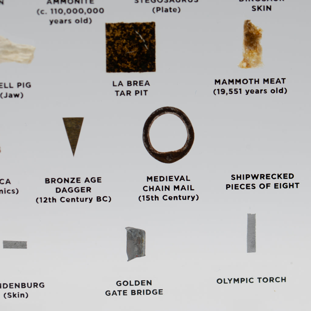 Asteroidengürtel (ca. 4.500.000.000 Jahre alt), Marsatmosphäre (Zagami-Meteorit), Libysches Wüstenglas (ca. 28.500.000 Jahre alt), Berg Fuji (Lava), Japanischer Sternensand (Foraminafera-Mikrofossilien), Dimetrodon-Rückensegel, Ammonit, Stegosaurus-Platte, Dinosaurierhaut, Rohsmaragd aus Kolumbien, Höllenschweinkiefer (Entelodont), La-Brea-Teergrube, Mammutfleisch (19.551 Jahre alt), Neandertaler-Faustkeil, Oasisamerica (antike Keramik), Dolch aus der Bronzezeit aus dem 12. Jahrhundert v. Chr., Mittelalterliches Kettenhemd aus dem 15. Jahrhundert n. Chr., Schiffswrack-Achterstücke, Versteinerter Blitz (Fulgurit), Hindenburg (Luftschiffhaut), Golden Gate Bridge, Olympische Fackel, Astronauten-Mixtape (Skylab, 1973), Der erste Supercomputer (Cray-1), Star Wars-Episode IV (Krayt-Drache), Mondbaum (Apollo 14)