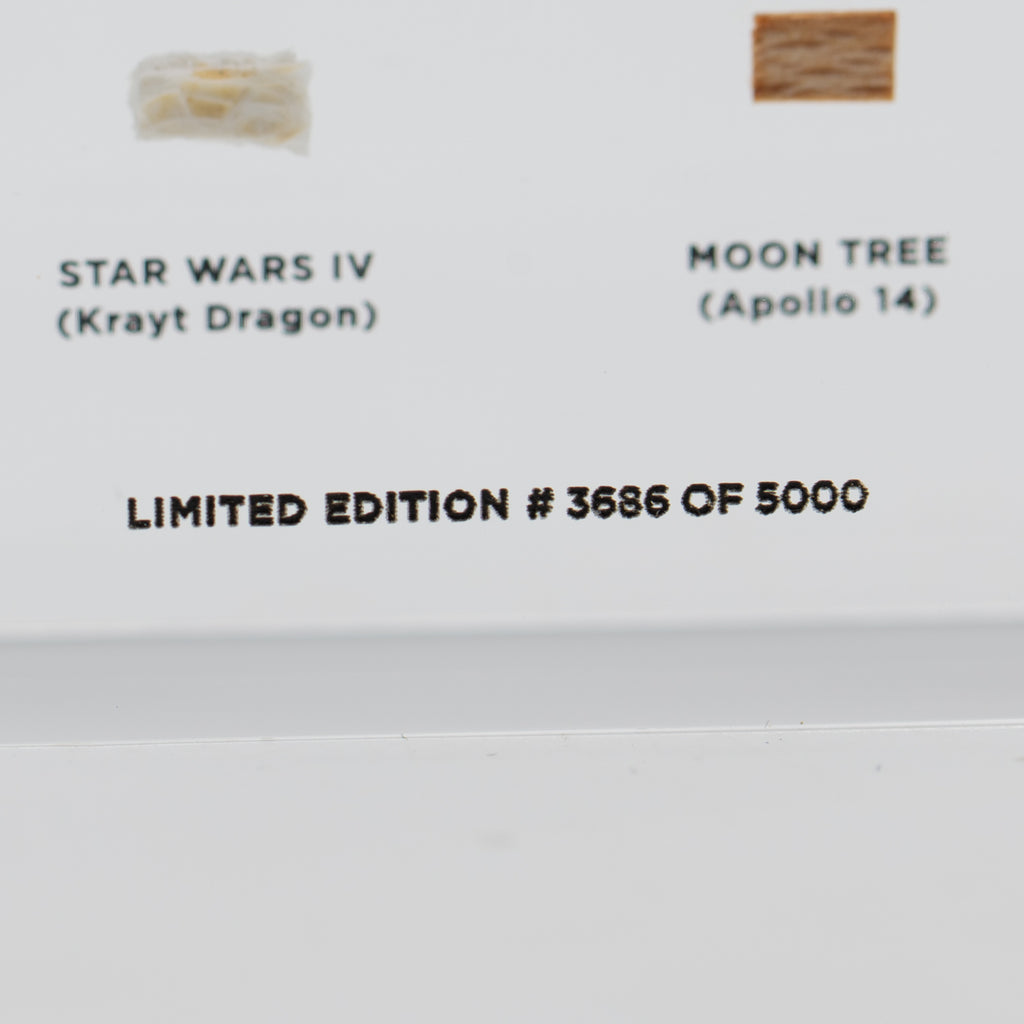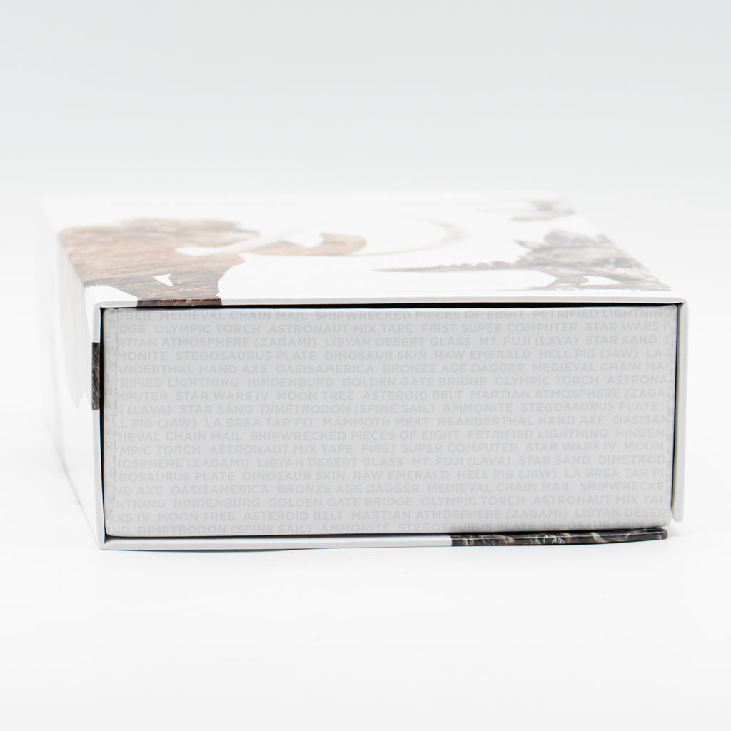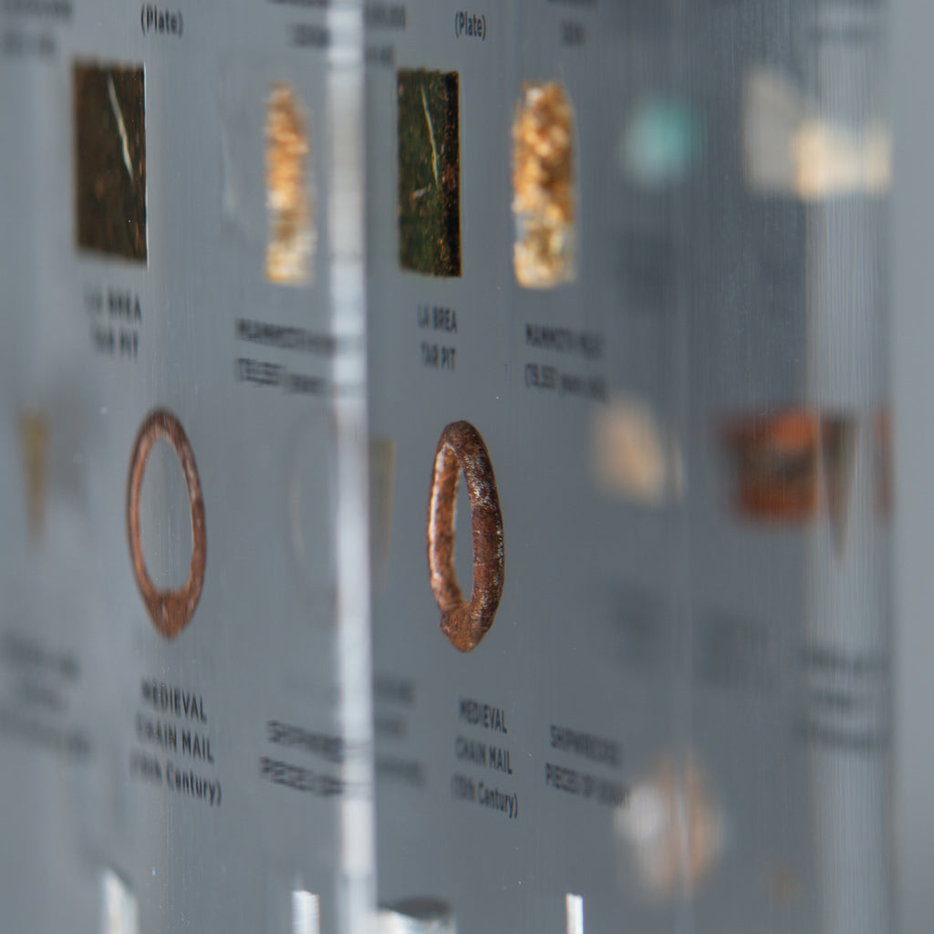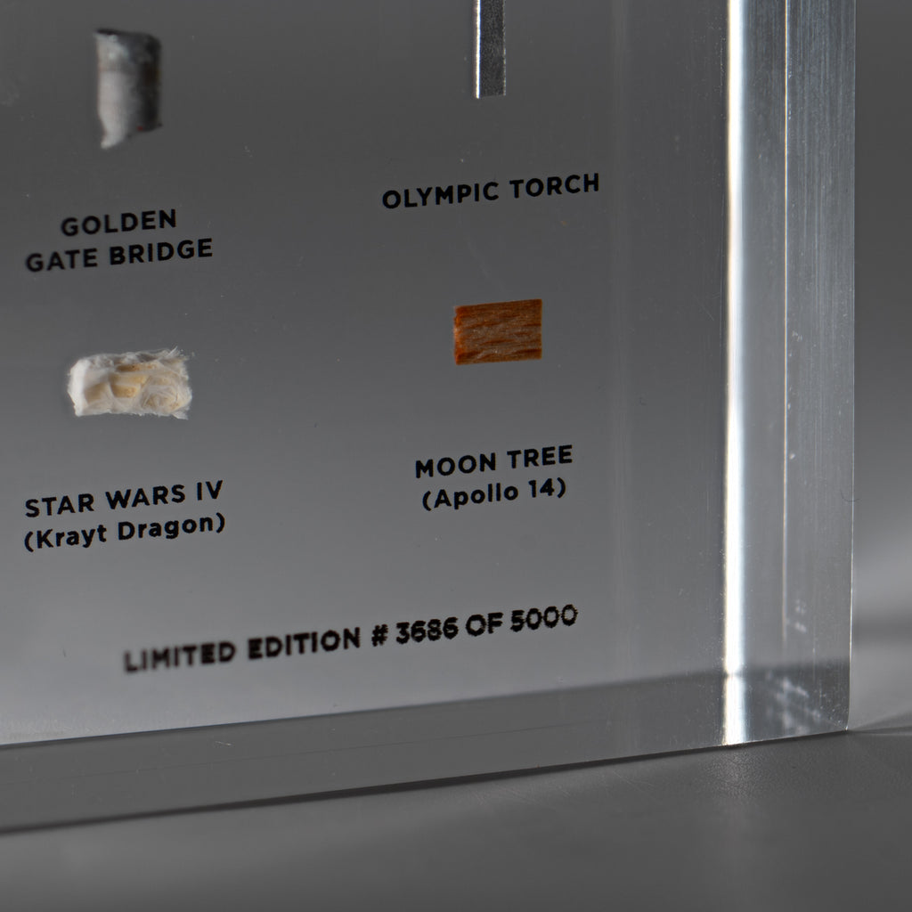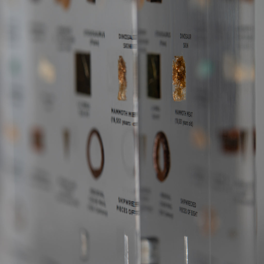 Asteroidengürtel (ca. 4.500.000.000 Jahre alt), Marsatmosphäre (Zagami-Meteorit), Libysches Wüstenglas (ca. 28.500.000 Jahre alt), Berg Fuji (Lava), Japanischer Sternensand (Foraminafera-Mikrofossilien), Dimetrodon-Rückensegel, Ammonit, Stegosaurus-Platte, Dinosaurierhaut, Rohsmaragd aus Kolumbien, Höllenschweinkiefer (Entelodont), La-Brea-Teergrube, Mammutfleisch (19.551 Jahre alt), Neandertaler-Faustkeil, Oasisamerica (antike Keramik), Dolch aus der Bronzezeit aus dem 12. Jahrhundert v. Chr., Mittelalterliches Kettenhemd aus dem 15. Jahrhundert n. Chr., Schiffswrack-Achterstücke, Versteinerter Blitz (Fulgurit), Hindenburg (Luftschiffhaut), Golden Gate Bridge, Olympische Fackel, Astronauten-Mixtape (Skylab, 1973), Der erste Supercomputer (Cray-1), Star Wars-Episode IV (Krayt-Drache), Mondbaum (Apollo 14)