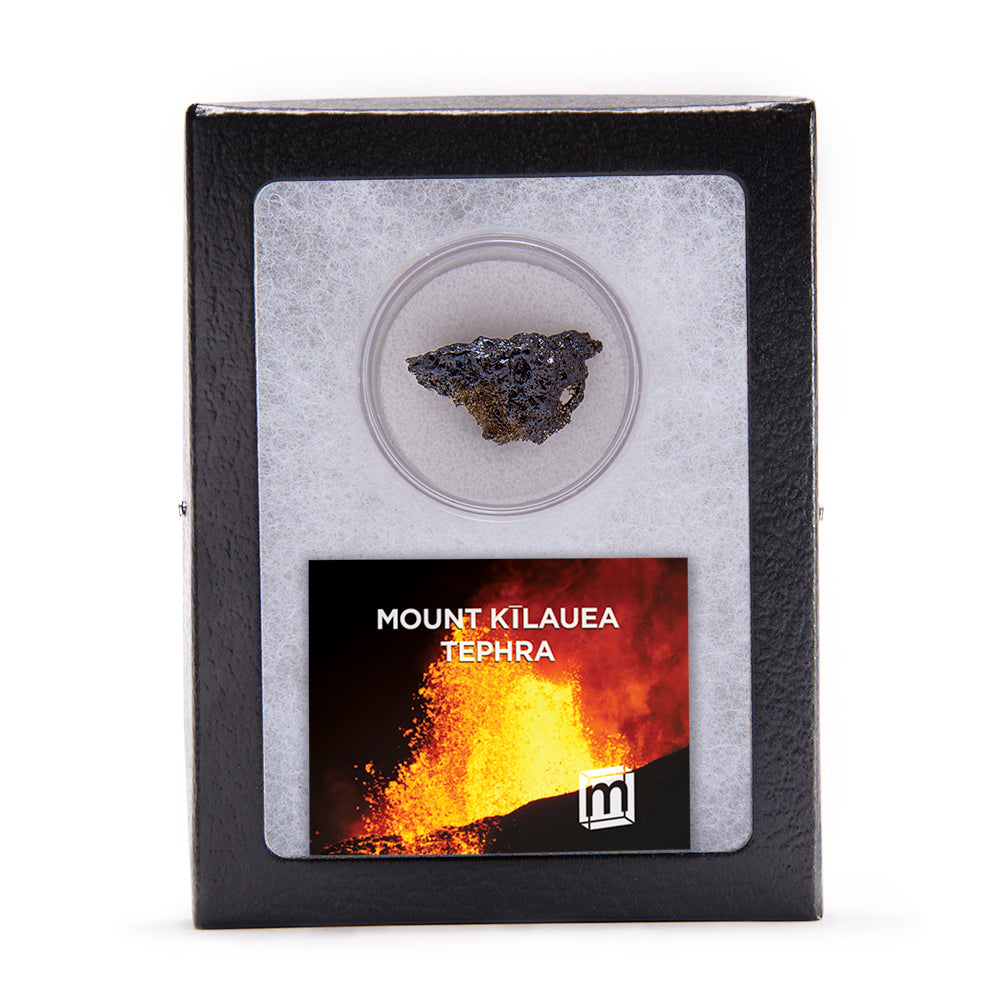 This specimen is a piece of tephra, a substance spewed forth from the 2018 lower Puna eruption of Mount Kīlauea. As it is quite a fragile specimen, the Mount Kīlauea Tephra is presented in a padded gem jar within a handsome glass-topped riker case for easy displaying.