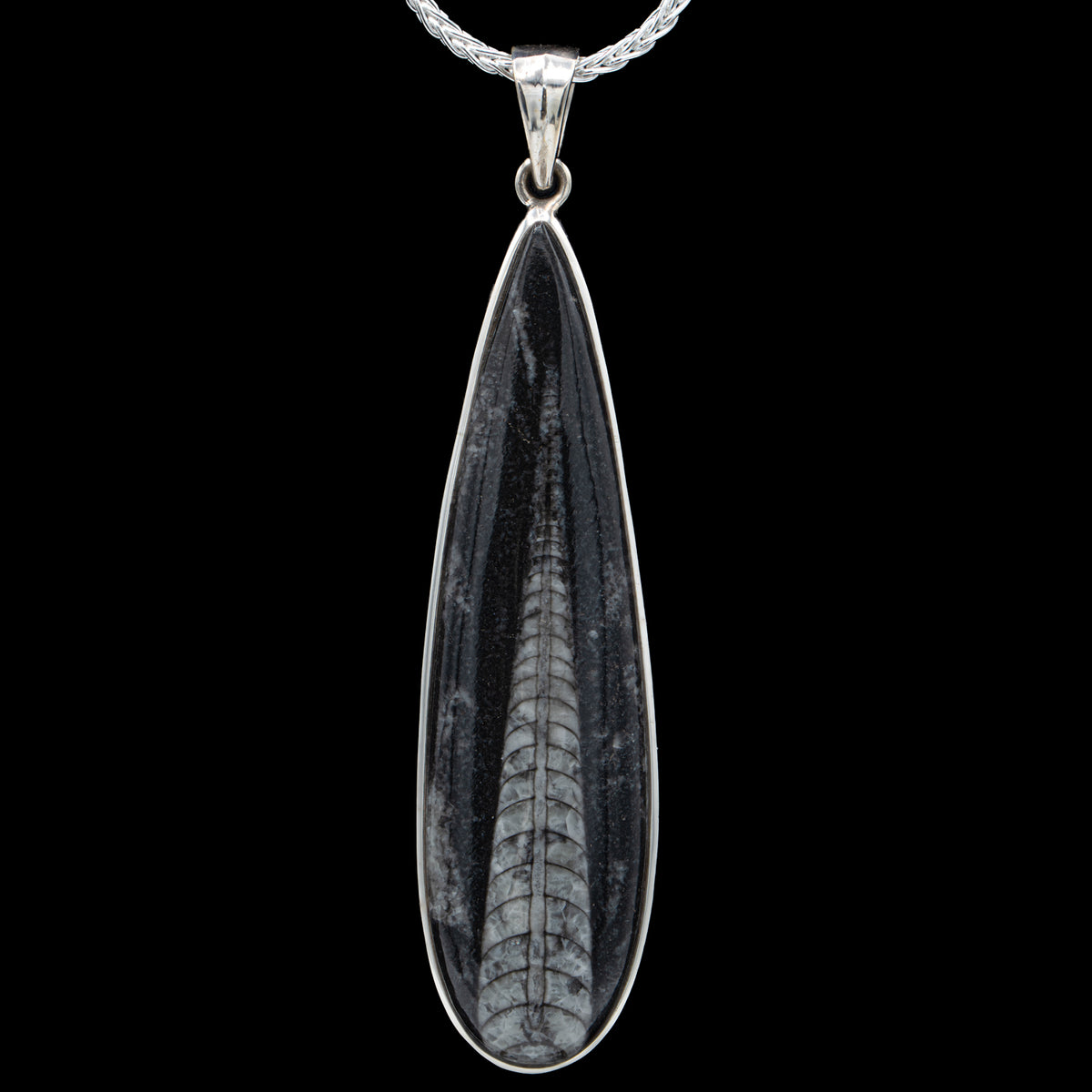Diese Halskette besteht aus einer Orthoceras-Muschel, die zu einem hellgrauen Material auf tiefschwarzem Untergrund versteinert ist. Das Fossil wurde von Hand poliert, um die gekammerten Septen freizulegen, die das Tier einst besaß und die auch 350.000.000 Jahre später noch sichtbar sind.
