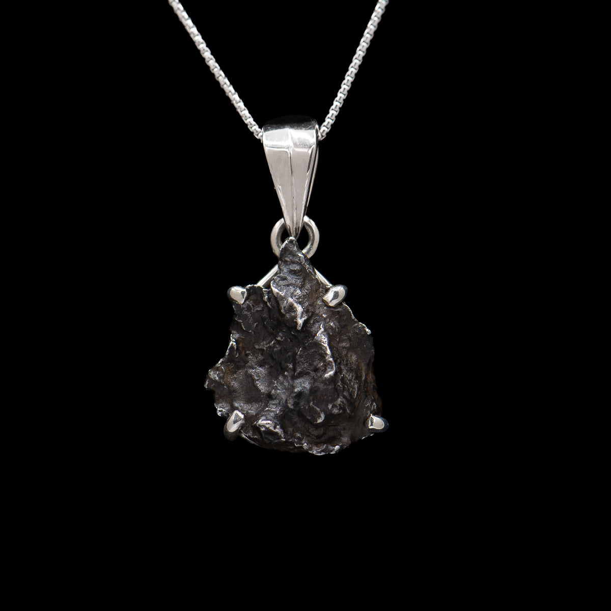 This pendant features a fragment from the Sikhote Alin meteorite. It is presented in a handsome display case with certificate of authenticity and features all sterling silver components.