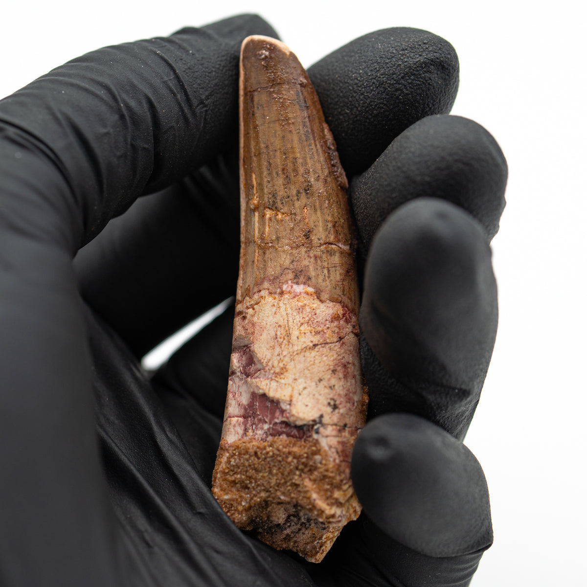Bitte beachten Sie: ALLE Spinosaurus-Zähne weisen Anzeichen von Reparatur auf. Zum Schutz des Exemplars während des Transports ist jeder Spinosaurus-Zahn einzeln verpackt.