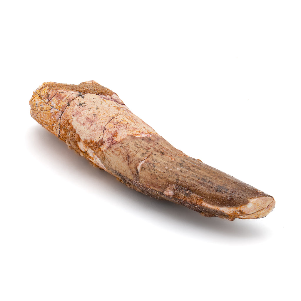This specimen is a naturally worn, fossilized crown and partial root of a real Spinosaurus tooth from the Kem Kem fossil beds of Morocco. It measures 2.603" in length.