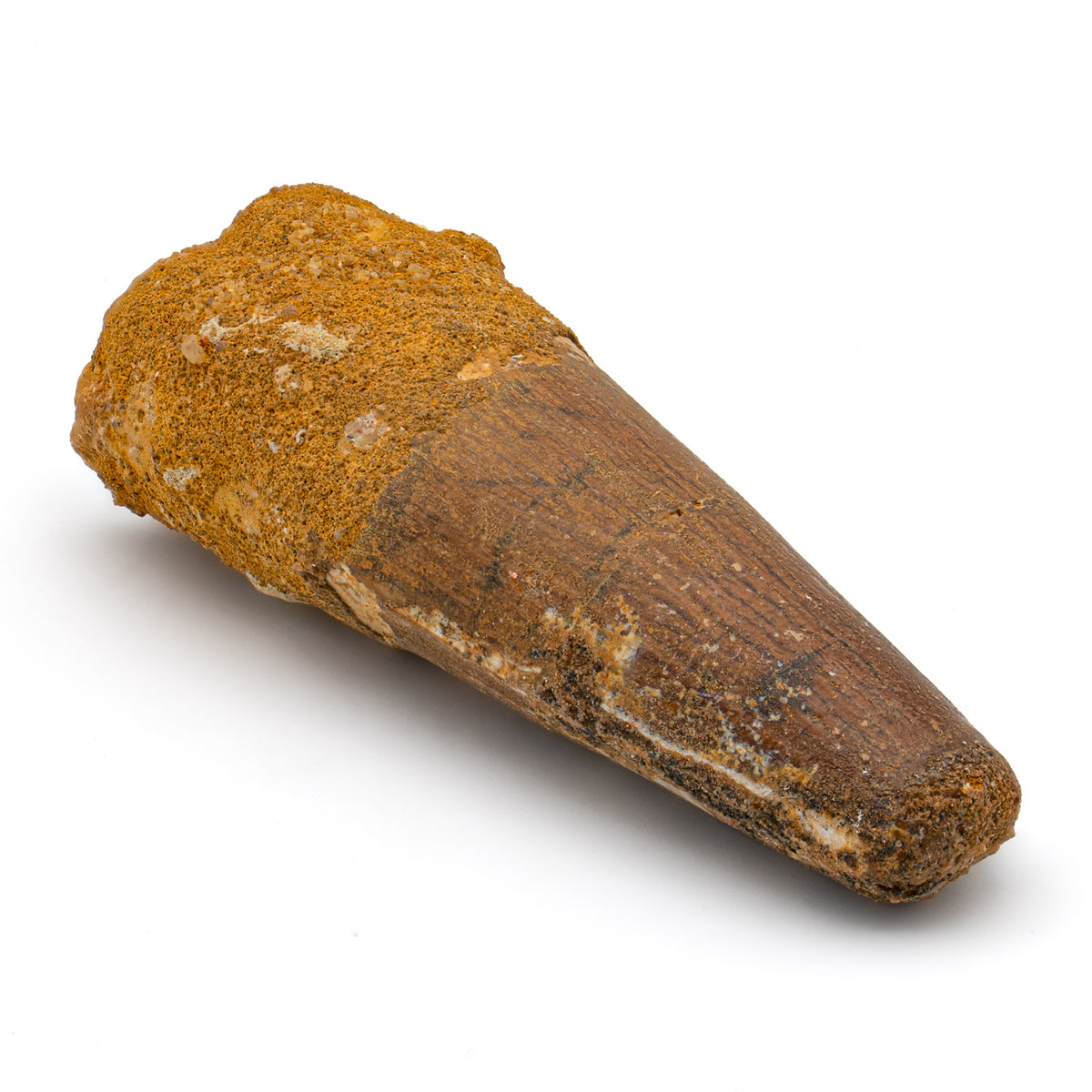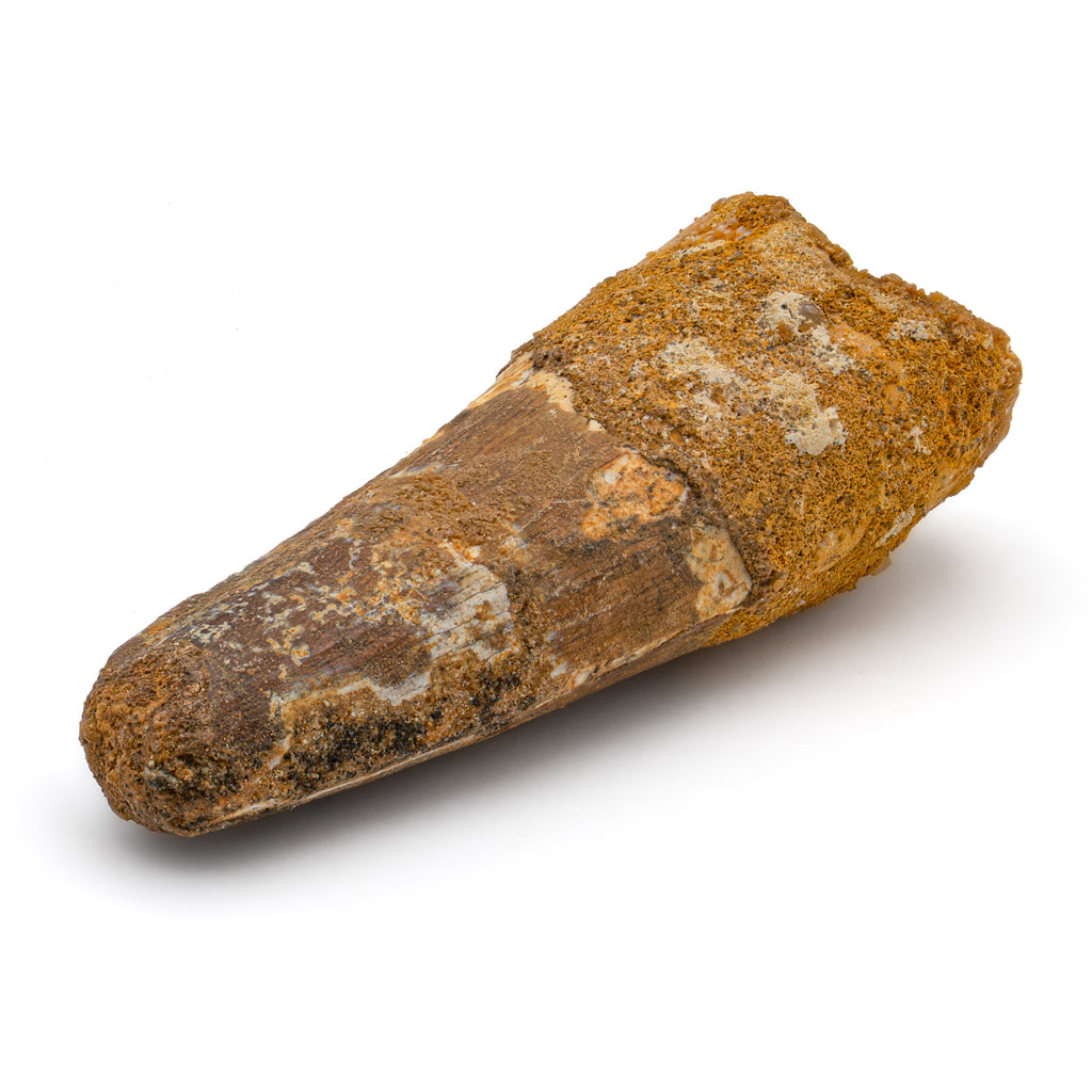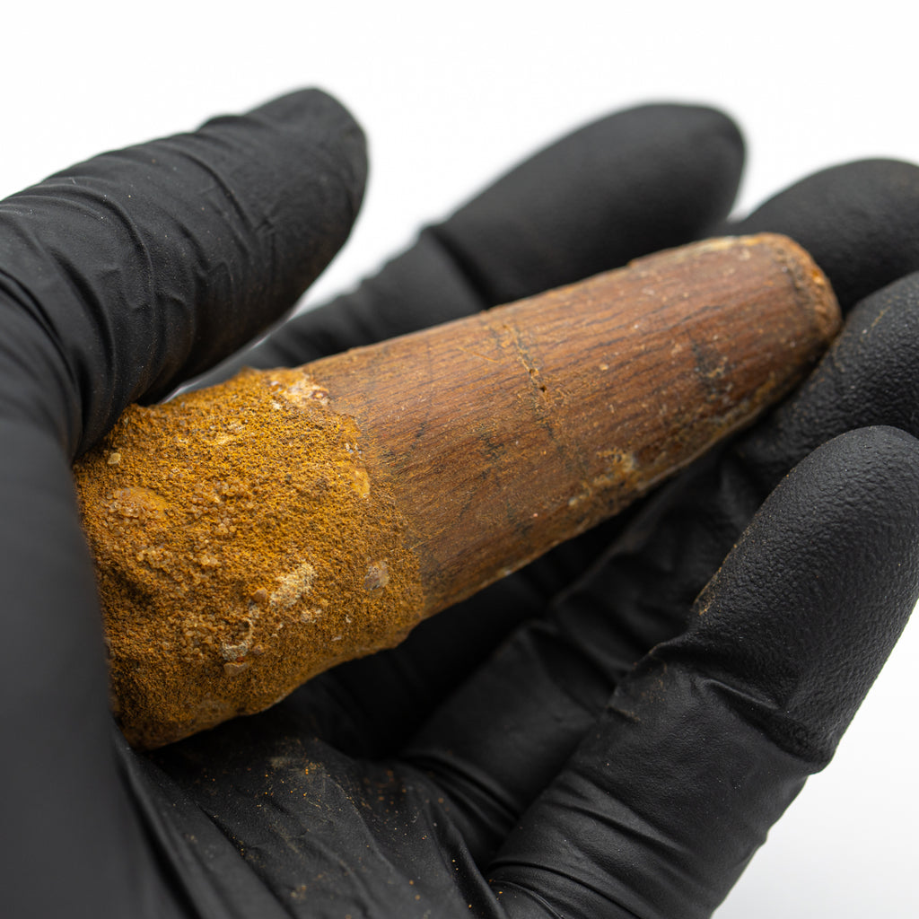 This specimen is a naturally worn crown and partial root of a real, fossilized Spinosaurus tooth from the Kem Kem fossil beds of Morocco. It measures 2.615" in length.