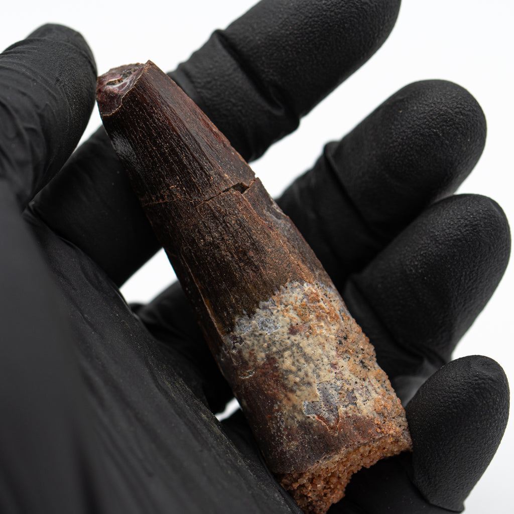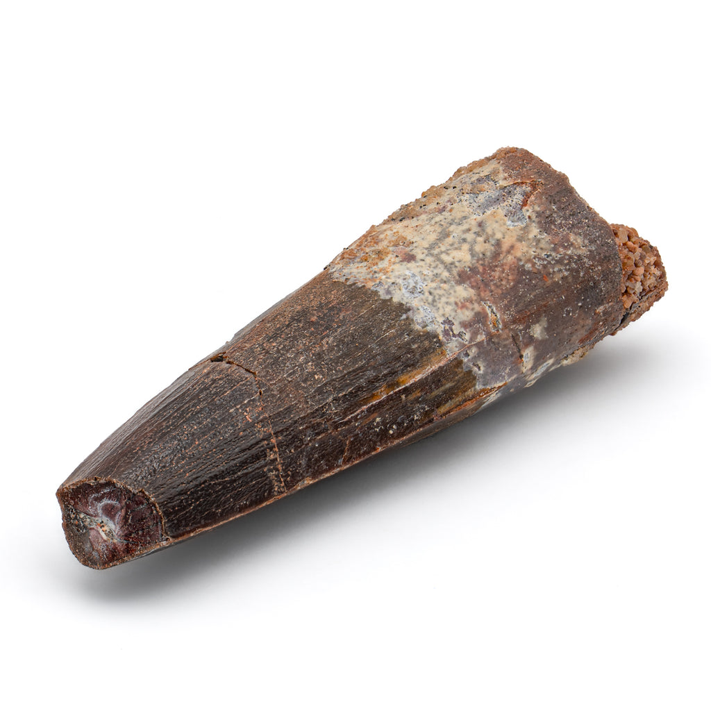 This specimen is a naturally worn crown and partial root of a real, fossilized Spinosaurus tooth from the Kem Kem fossil beds of Morocco. It measures 2.802" in length.