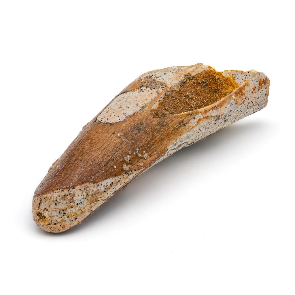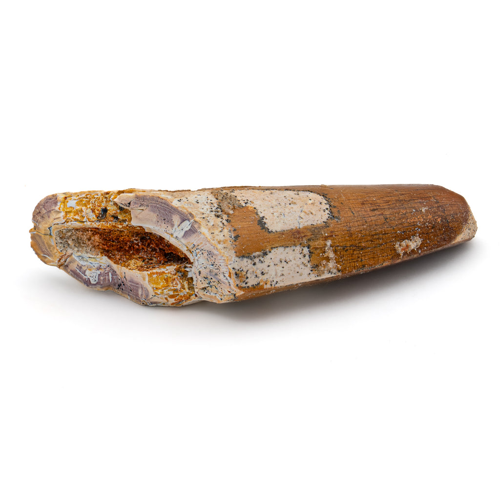 This specimen is a naturally worn crown and partial root of a real, fossilized Spinosaurus tooth from the Kem Kem fossil beds of Morocco. It measures 2.736" in length.