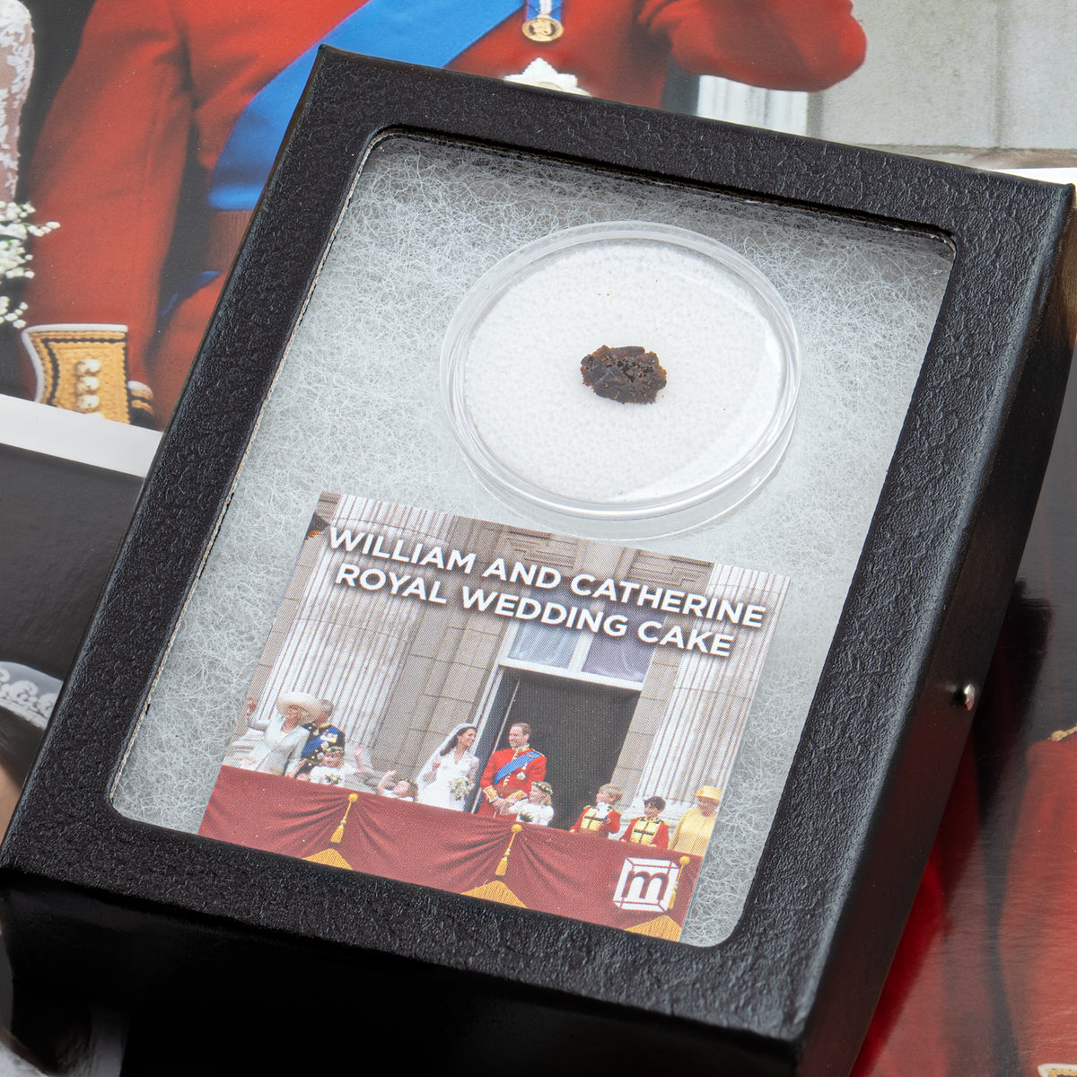 Dieses Exemplar ist ein kleines Beispiel eines Kuchenstücks von der Hochzeit von William und Catherine. Jedes handgeschnittene Kuchenstück ist in einem Acrylglas eingeschlossen und wird in einer unserer klassischen Riker-Vitrine mit Glasdeckel präsentiert. Die Riker-Vitrine misst 11,5 x 8,5 cm. Eine kleine Informationskarte ist ebenfalls enthalten und dient als Echtheitszertifikat.