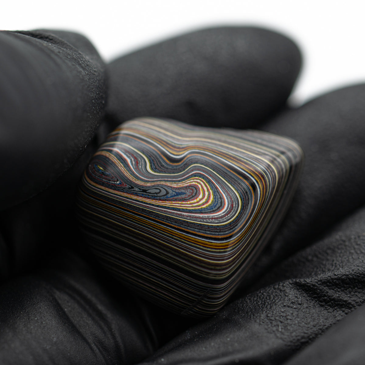 During the post-war Golden Age of Automobiles, factory workers from several different manufacturers discovered something curious. During the painting process, layers upon layers of automobile paint would accumulate into a layered and beautiful material. When heated and polished, this man-made "motor agate" reveals the colors of the cars that once passed through these factories.