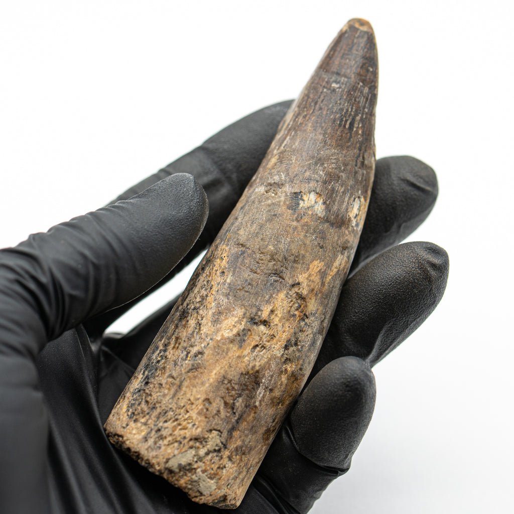 This specimen is a naturally worn crown and partial root of a real, fossilized Spinosaurus tooth from the Kem Kem fossil beds of Morocco. It measures 3.937" in length.