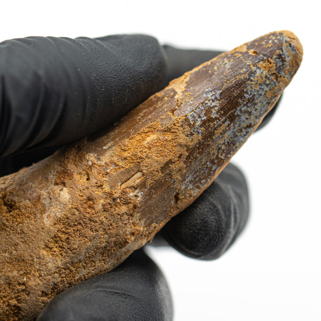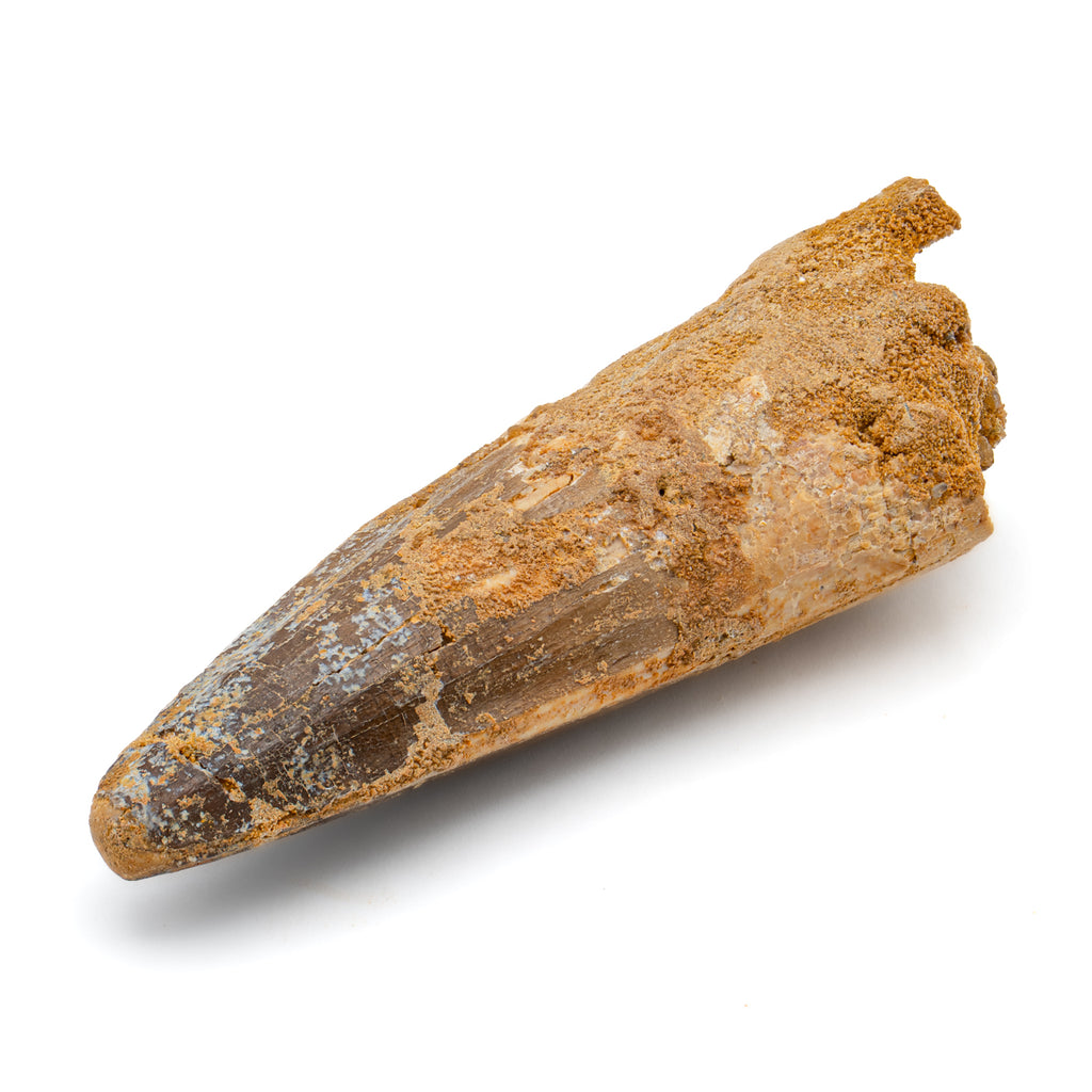 This specimen is a naturally worn crown and partial root of a real, fossilized Spinosaurus tooth from the Kem Kem fossil beds of Morocco. It measures 2.878" in length.