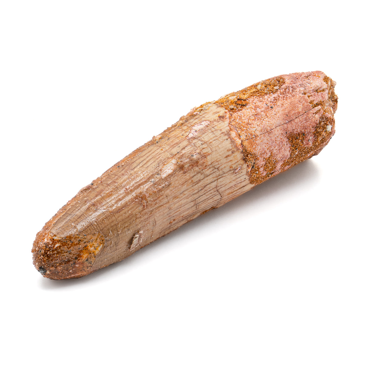 This specimen is a naturally worn, fossilized crown and partial root of a real Spinosaurus tooth from the Kem Kem fossil beds of Morocco. It measures 2.101" in length.