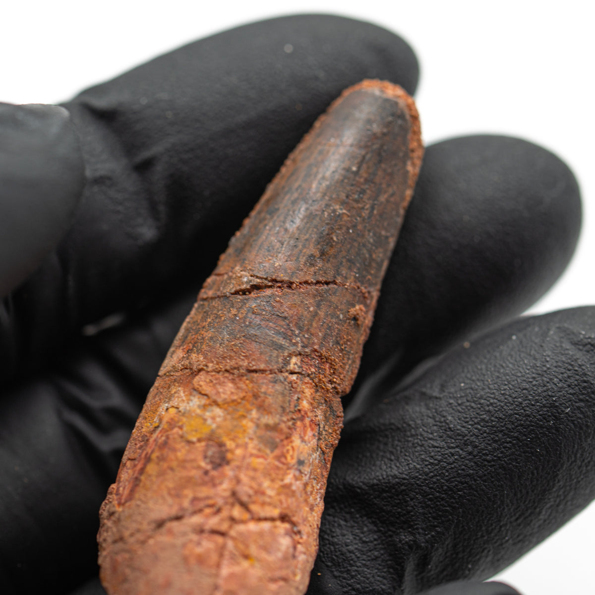 This specimen is a naturally worn, fossilized crown and partial root of a real Spinosaurus tooth from the Kem Kem fossil beds of Morocco. It measures 2.190" in length.
