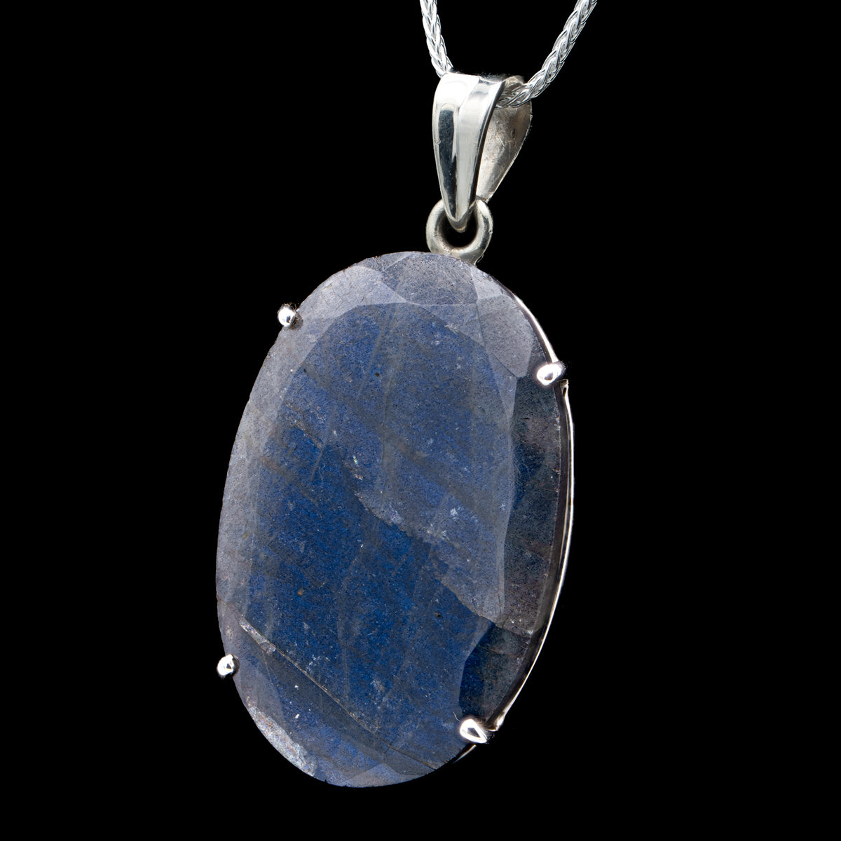 This pendant contains a 1.41" faceted labradorite centerpiece. We were drawn to these beautiful minerals specifically due to the way they capture and reflect the light. Due to each stone's unique shape and coloring, the faceted labradorite pendants are priced and sold individually. All pendants are set in Sterling Silver. The 18" wheat chain is also 100% Sterling Silver.