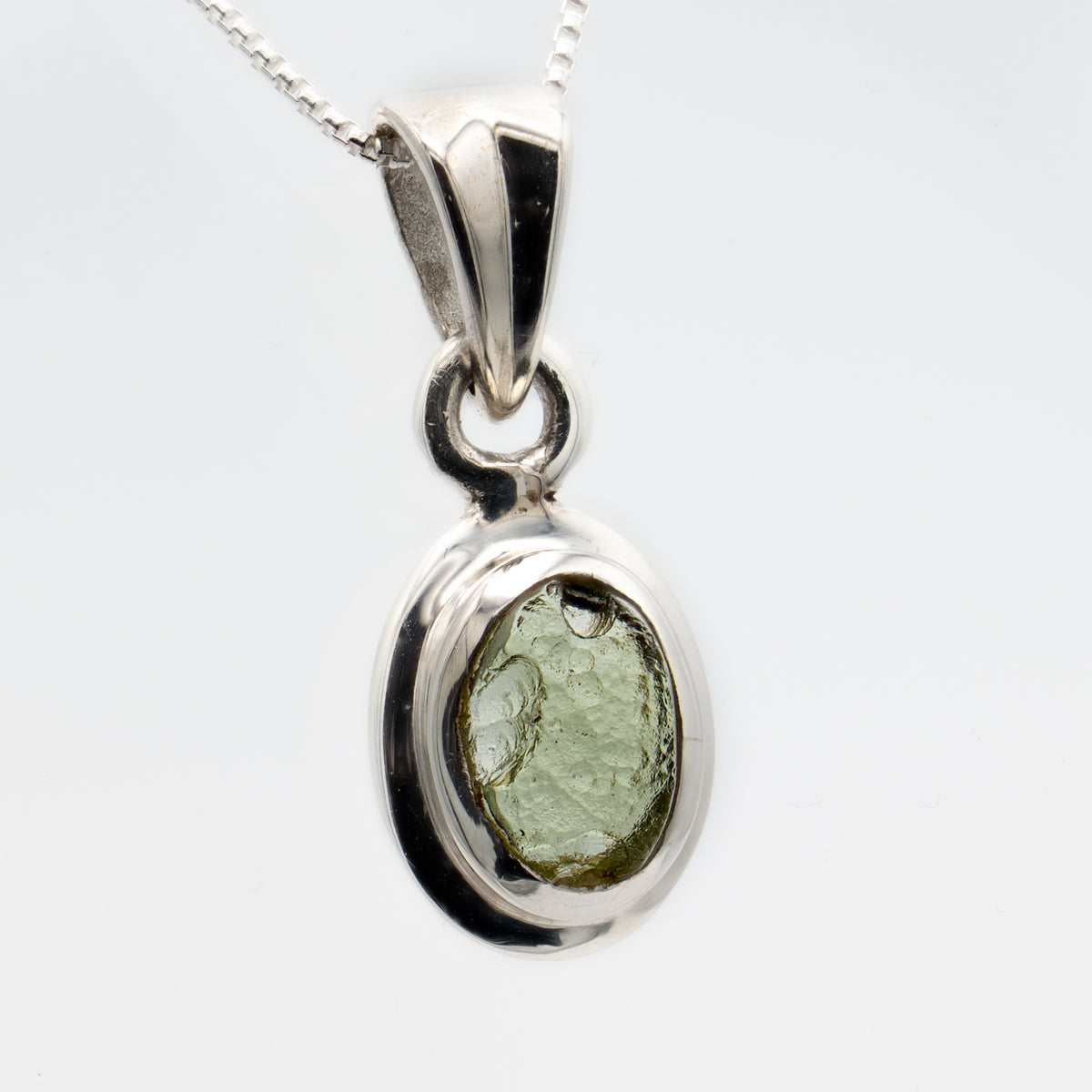 This 0.371" tektite is set into a sterling silver bezel and contains a chain of the same material. Each necklace comes in a decorative box and includes a small information card about the specimen. The card serves as the certificate of authenticity and can be found underneath the padded lining of the display box.