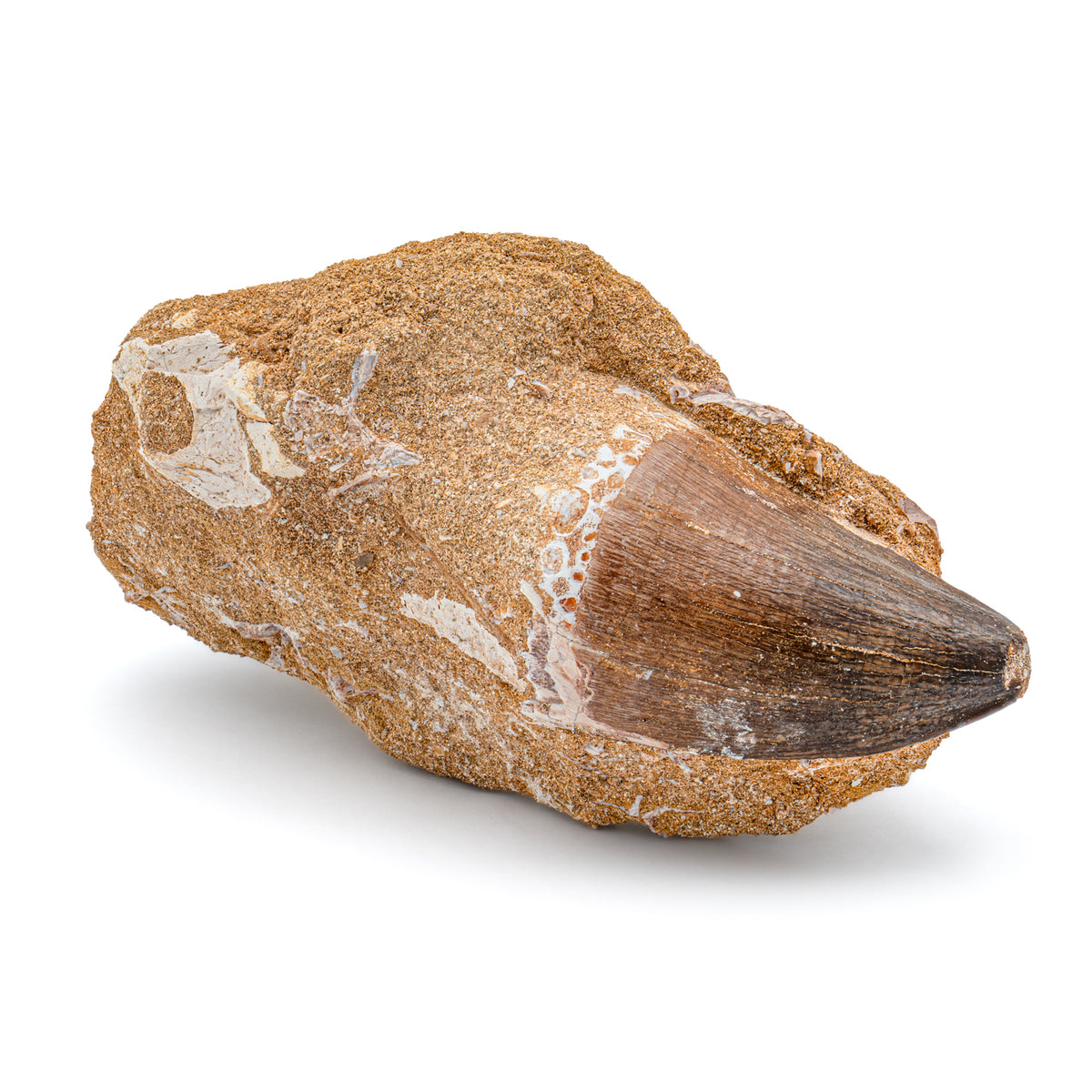 This specimen is a Mosasaur tooth embedded in matrix. It was recovered from deposits in Morocco and dates to the Late Cretaceous Period. The exposed tooth measures 2.03". The surrounding matrix also includes a number of additional small fossils. The specimen ships in a sturdy shipping carton. A small information card is enclosed that also serves as the certificate of authenticity.