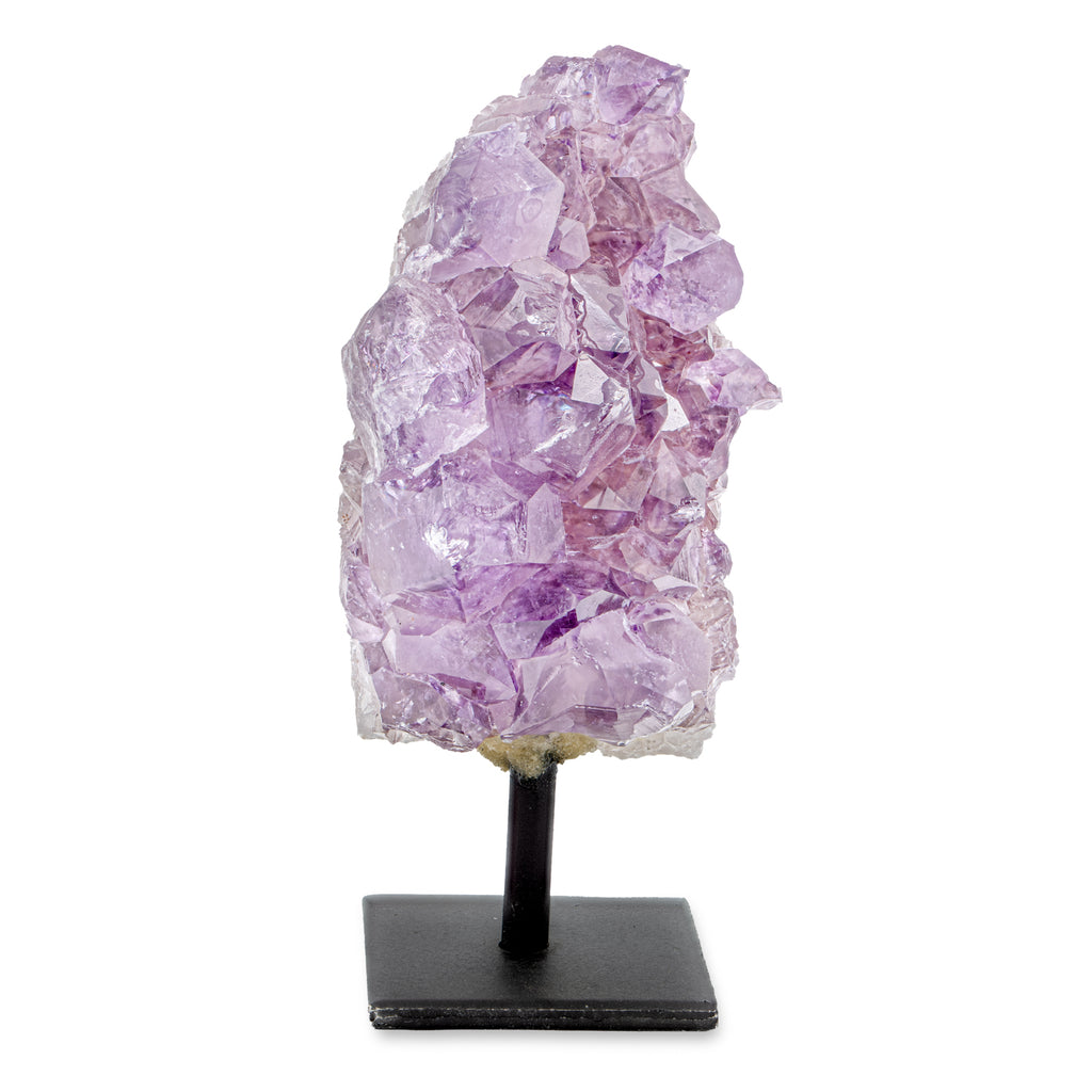 This particular specimen is a single amethyst cluster from Brazil. The cluster measures 3.731" at the tallest point. It is firmly mounted in a sturdy steel stand and is perfect for tabletop display. The specimen ships with an individual certificate of authenticity.