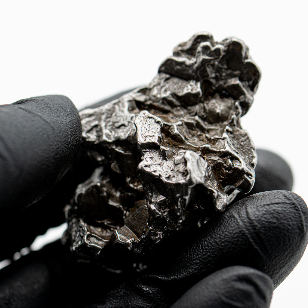 This specimen is a complete 65.77g Campo Del Cielo meteorite from Argentina. The IAB meteorite is thought to have fallen in 2500 BCE and was a source of valuable metals as well as an inspiration for creation myths. The impact area was originally called Piguem Nonralta by the locals, though Spanish colonists renamed it in 1576 CE as Campo del Cielo, or, "Field of Heaven."
