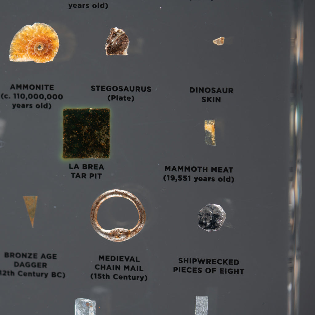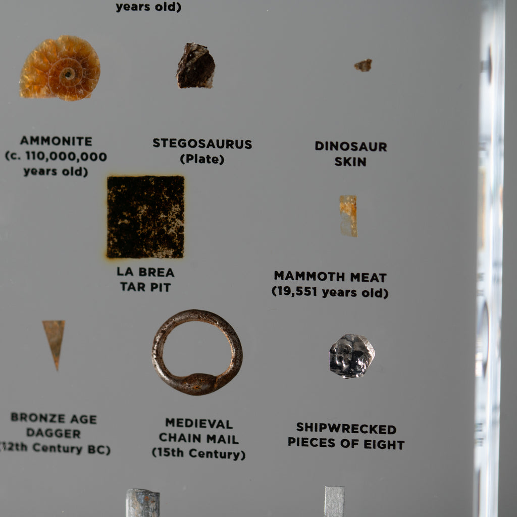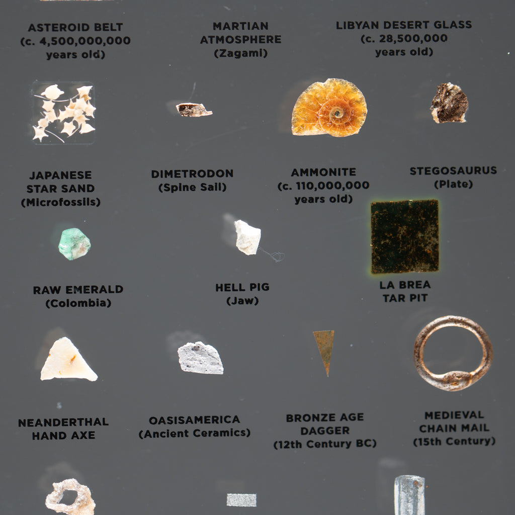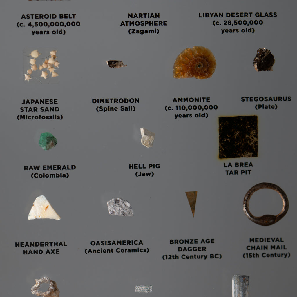 Asteroid Belt (c. 4,500,000,000 Years Old), Martian Atmosphere (Zagami Meteorite), Libyan Desert Glass (c. 28,500,000 Years Old), Mt. Fuji (Lava), Japanese Star Sand (Foraminafera Microfossils), Dimetrodon Spine Sail, Ammonite, Stegosaurus Plate, Dinosaur Skin, Raw Emerald from Colombia, Hell Pig Jaw (Entelodont), La Brea Tar Pit, Mammoth Meat (19,551 Years Old), Neanderthal Hand Axe, Oasisamerica (Ancient Ceramics), Bronze Age Dagger from the 12th Century BCE, Medieval Chain Mail from the 15th Century CE, Shipwrecked Pieces of Eight, Petrified Lightning (Fulgurite), Hindenburg (Airship Skin), the Golden Gate Bridge, Olympic Relay Torch, Astronaut Mix Tape (Skylab, 1973), the First Super Computer (Cray-1), Star Wars Episode IV (Krayt Dragon), Moon Tree (Apollo 14)