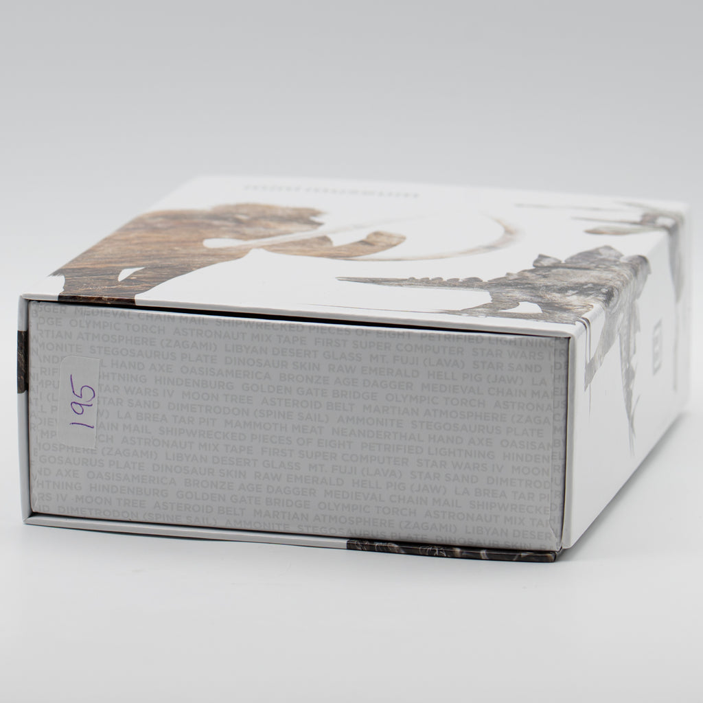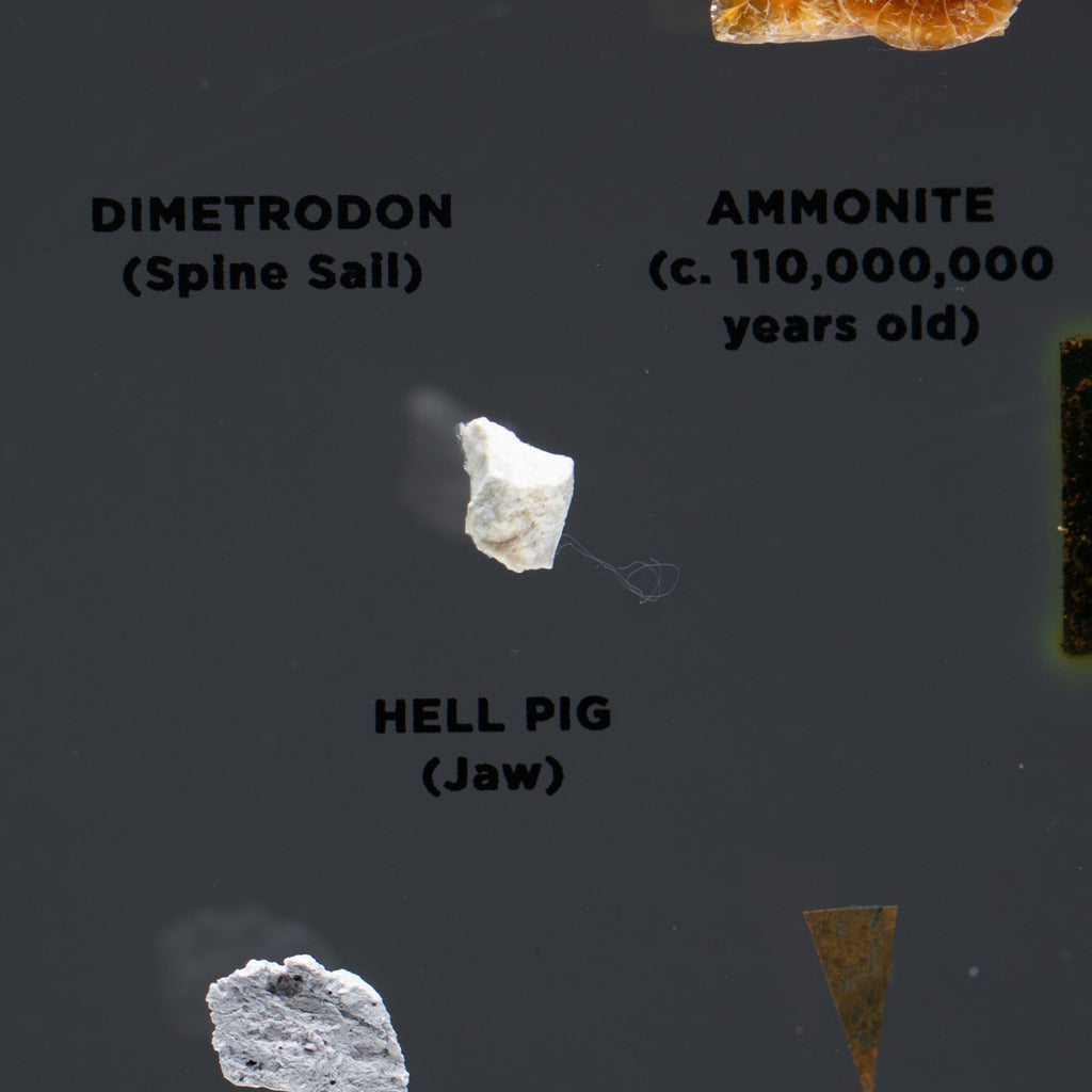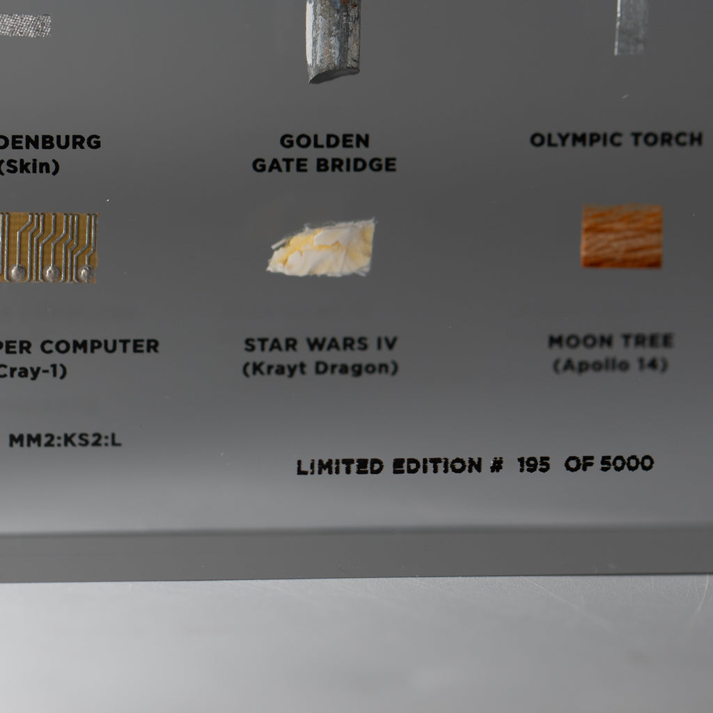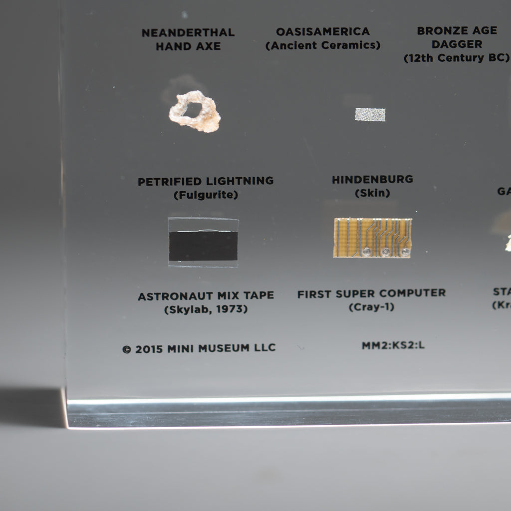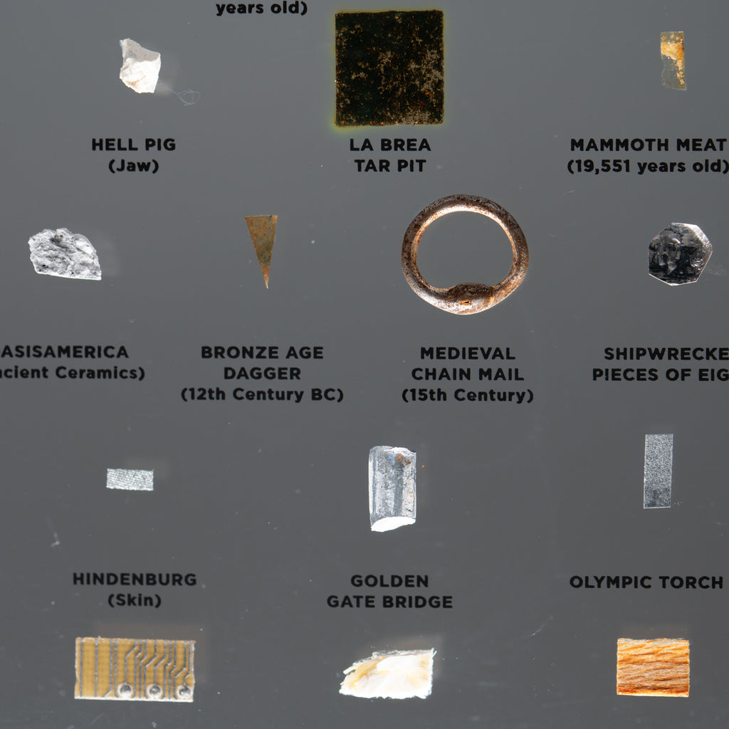 Asteroid Belt (c. 4,500,000,000 Years Old), Martian Atmosphere (Zagami Meteorite), Libyan Desert Glass (c. 28,500,000 Years Old), Mt. Fuji (Lava), Japanese Star Sand (Foraminafera Microfossils), Dimetrodon Spine Sail, Ammonite, Stegosaurus Plate, Dinosaur Skin, Raw Emerald from Colombia, Hell Pig Jaw (Entelodont), La Brea Tar Pit, Mammoth Meat (19,551 Years Old), Neanderthal Hand Axe, Oasisamerica (Ancient Ceramics), Bronze Age Dagger from the 12th Century BCE, Medieval Chain Mail from the 15th Century CE, Shipwrecked Pieces of Eight, Petrified Lightning (Fulgurite), Hindenburg (Airship Skin), the Golden Gate Bridge, Olympic Relay Torch, Astronaut Mix Tape (Skylab, 1973), the First Super Computer (Cray-1), Star Wars Episode IV (Krayt Dragon), Moon Tree (Apollo 14)