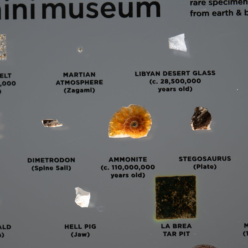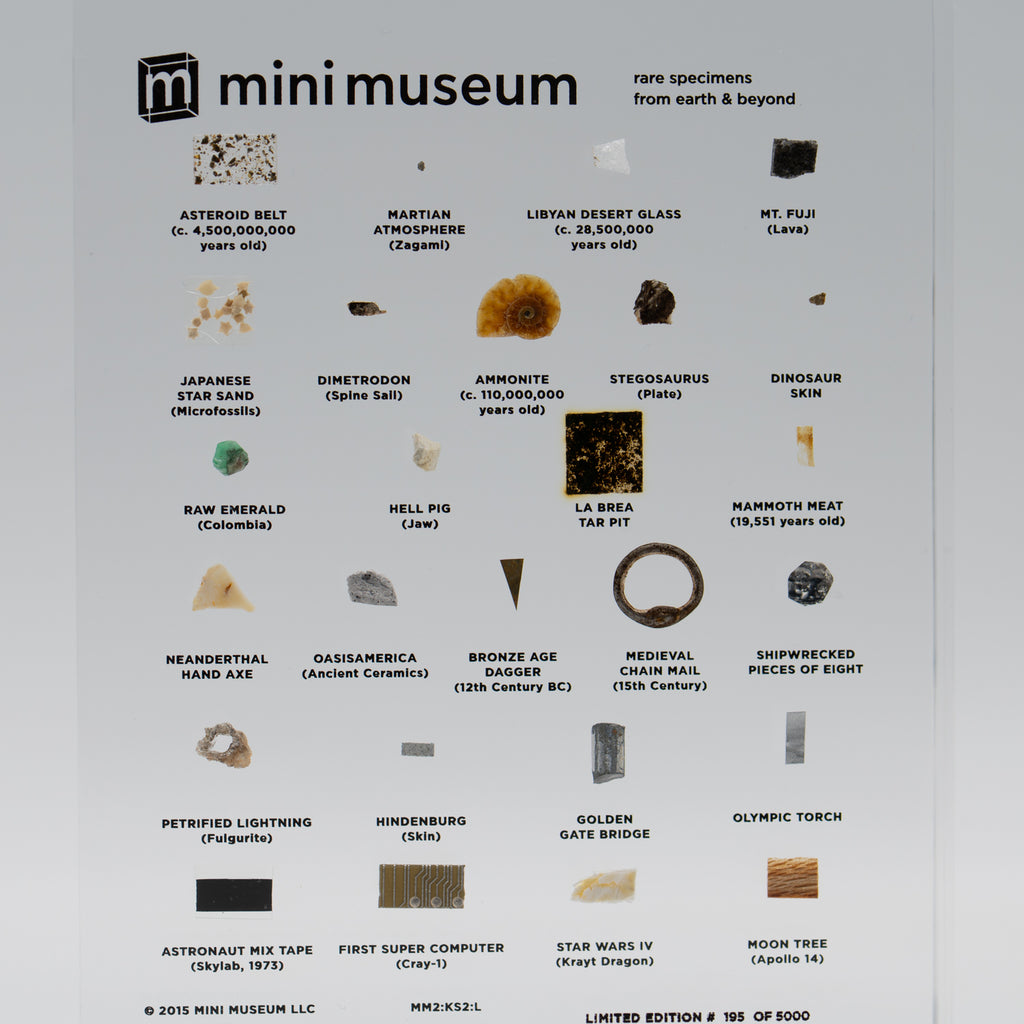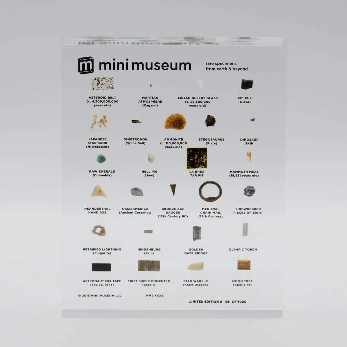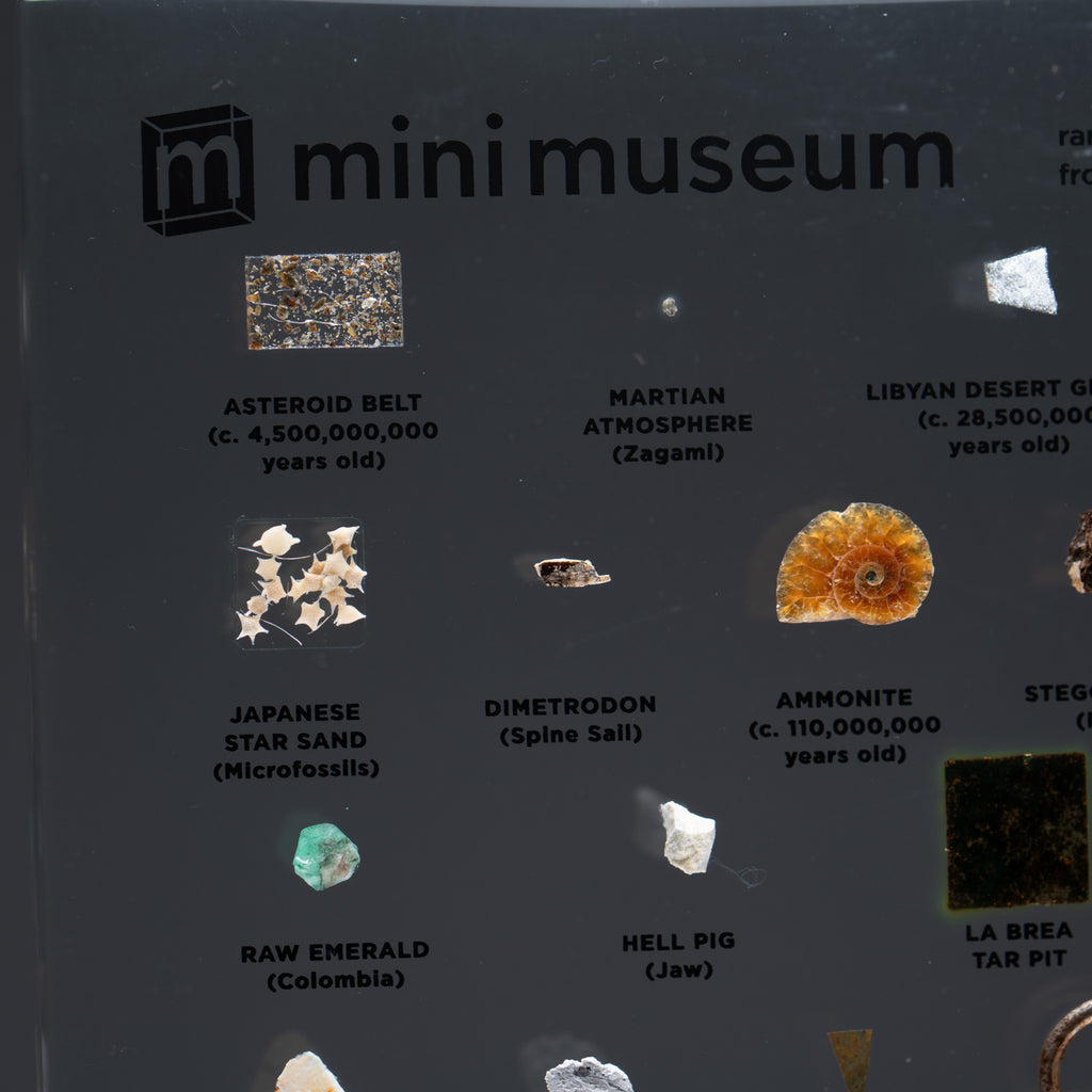 The Mini Museum is a handcrafted, limited edition collectible. The unique specimens are artfully arranged and clearly labeled. The entire collection is encased in Lucite acrylic and designed to inspire for generations.