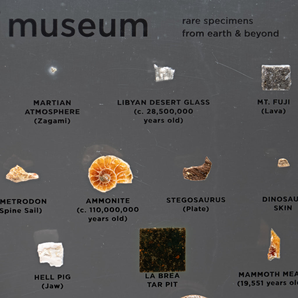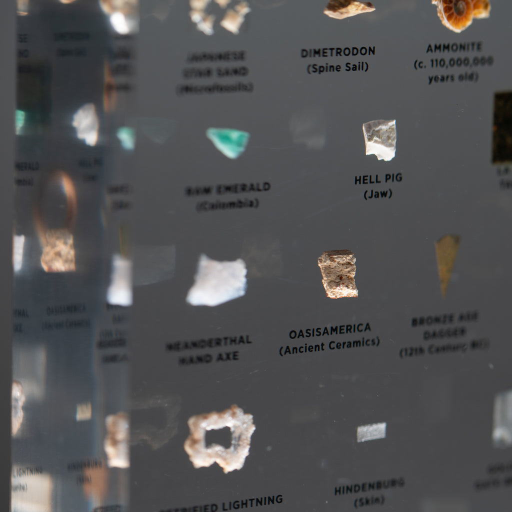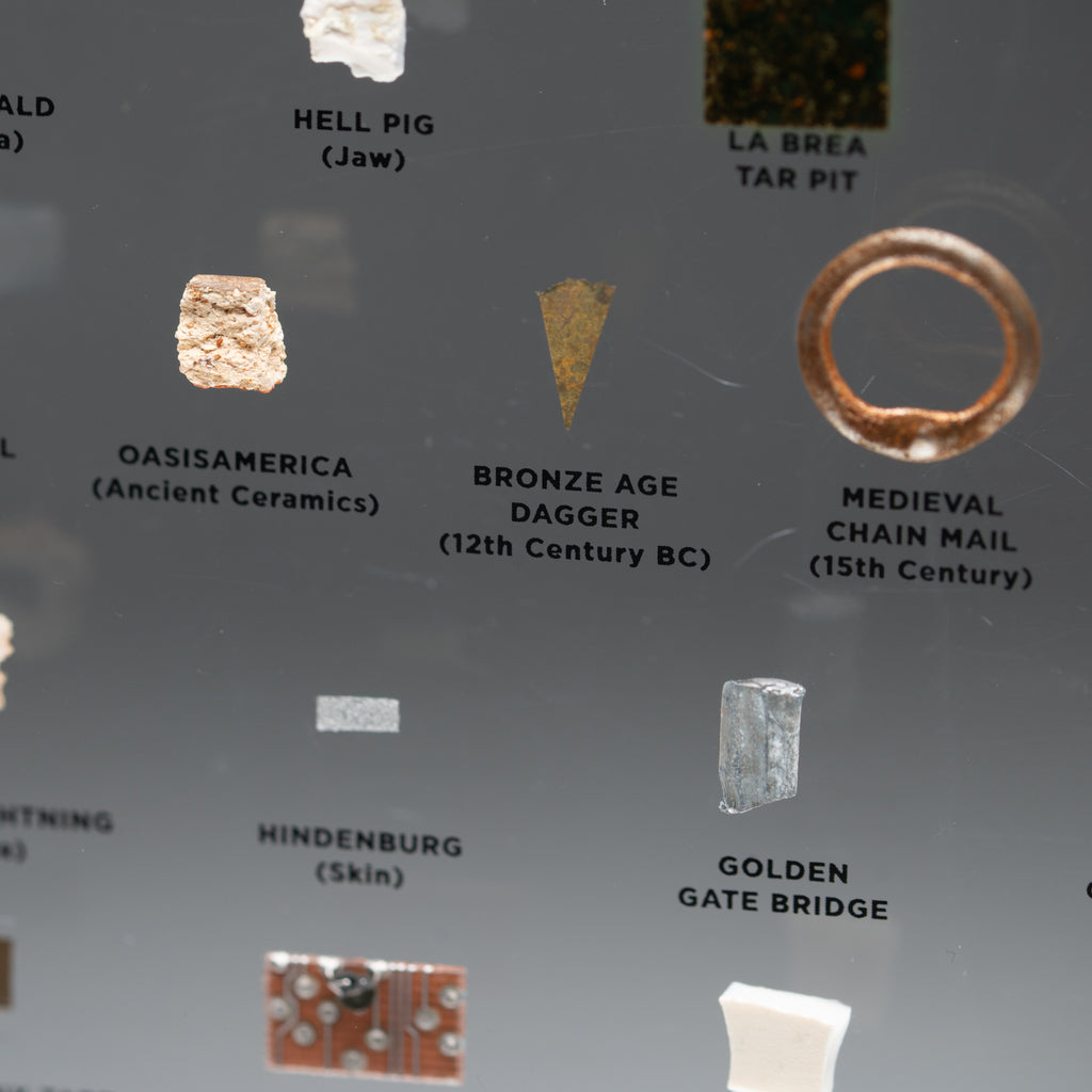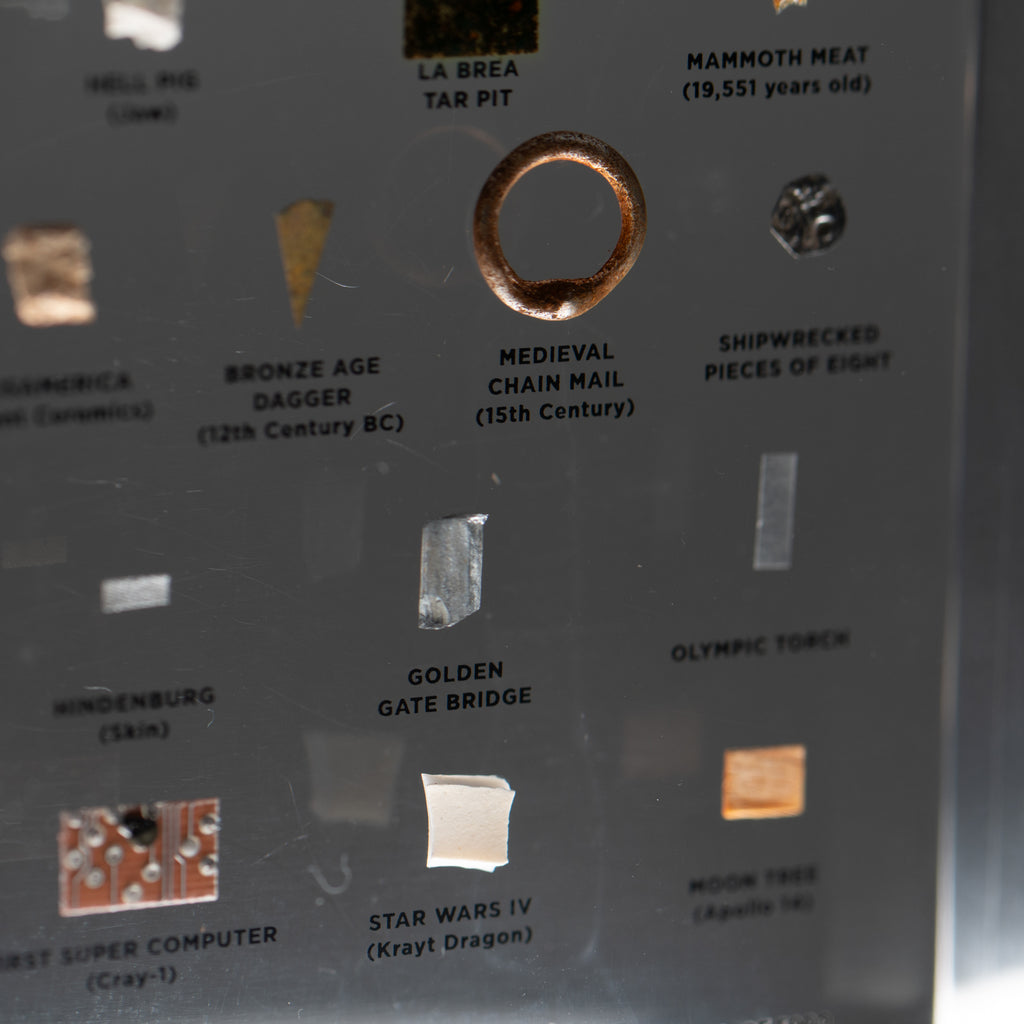 Asteroid Belt (c. 4,500,000,000 Years Old), Martian Atmosphere (Zagami Meteorite), Libyan Desert Glass (c. 28,500,000 Years Old), Mt. Fuji (Lava), Japanese Star Sand (Foraminafera Microfossils), Dimetrodon Spine Sail, Ammonite, Stegosaurus Plate, Dinosaur Skin, Raw Emerald from Colombia, Hell Pig Jaw (Entelodont), La Brea Tar Pit, Mammoth Meat (19,551 Years Old), Neanderthal Hand Axe, Oasisamerica (Ancient Ceramics), Bronze Age Dagger from the 12th Century BCE, Medieval Chain Mail from the 15th Century CE, Shipwrecked Pieces of Eight, Petrified Lightning (Fulgurite), Hindenburg (Airship Skin), the Golden Gate Bridge, Olympic Relay Torch, Astronaut Mix Tape (Skylab, 1973), the First Super Computer (Cray-1), Star Wars Episode IV (Krayt Dragon), Moon Tree (Apollo 14)