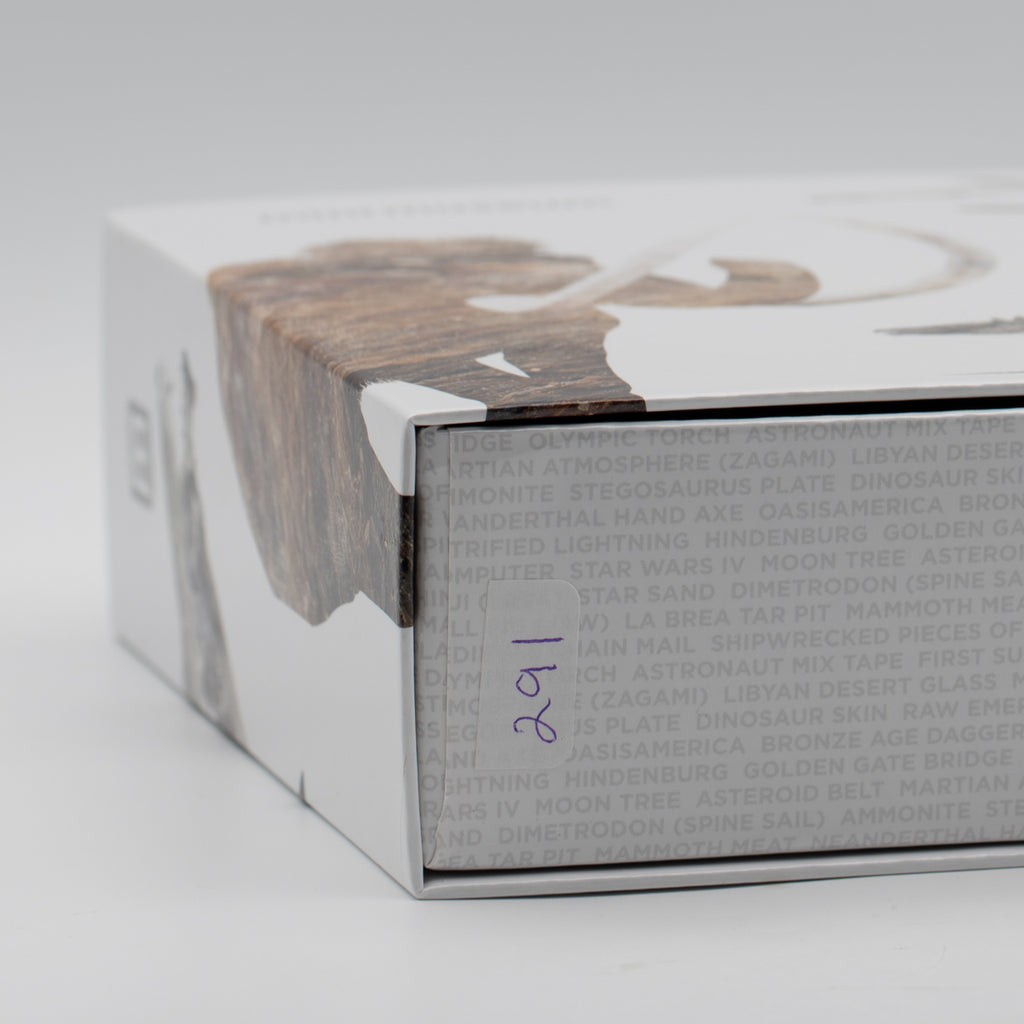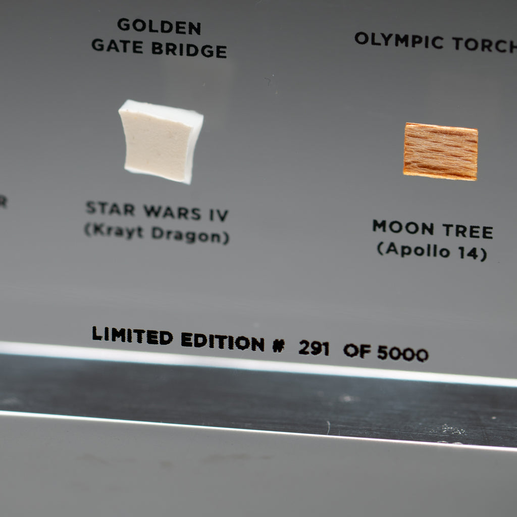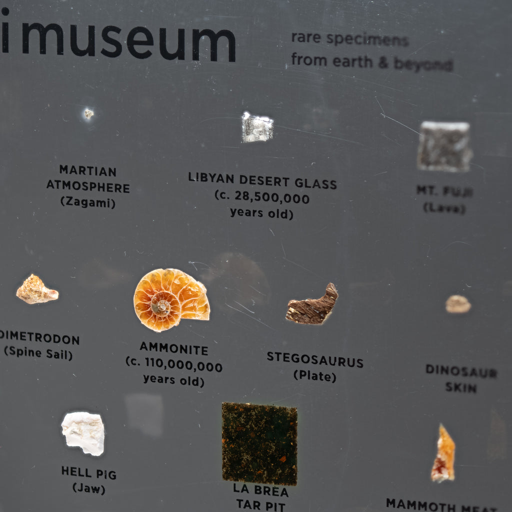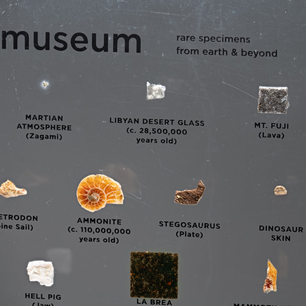 Asteroid Belt (c. 4,500,000,000 Years Old), Martian Atmosphere (Zagami Meteorite), Libyan Desert Glass (c. 28,500,000 Years Old), Mt. Fuji (Lava), Japanese Star Sand (Foraminafera Microfossils), Dimetrodon Spine Sail, Ammonite, Stegosaurus Plate, Dinosaur Skin, Raw Emerald from Colombia, Hell Pig Jaw (Entelodont), La Brea Tar Pit, Mammoth Meat (19,551 Years Old), Neanderthal Hand Axe, Oasisamerica (Ancient Ceramics), Bronze Age Dagger from the 12th Century BCE, Medieval Chain Mail from the 15th Century CE, Shipwrecked Pieces of Eight, Petrified Lightning (Fulgurite), Hindenburg (Airship Skin), the Golden Gate Bridge, Olympic Relay Torch, Astronaut Mix Tape (Skylab, 1973), the First Super Computer (Cray-1), Star Wars Episode IV (Krayt Dragon), Moon Tree (Apollo 14)