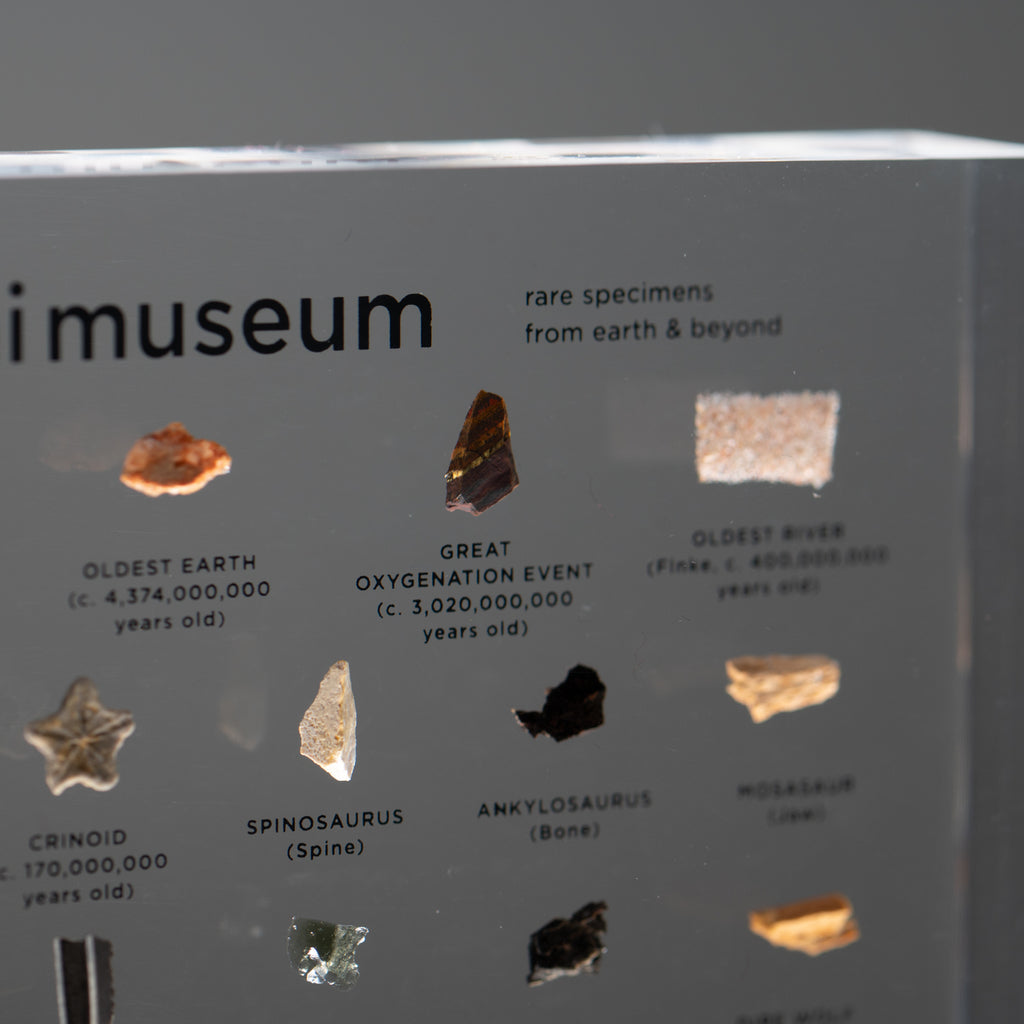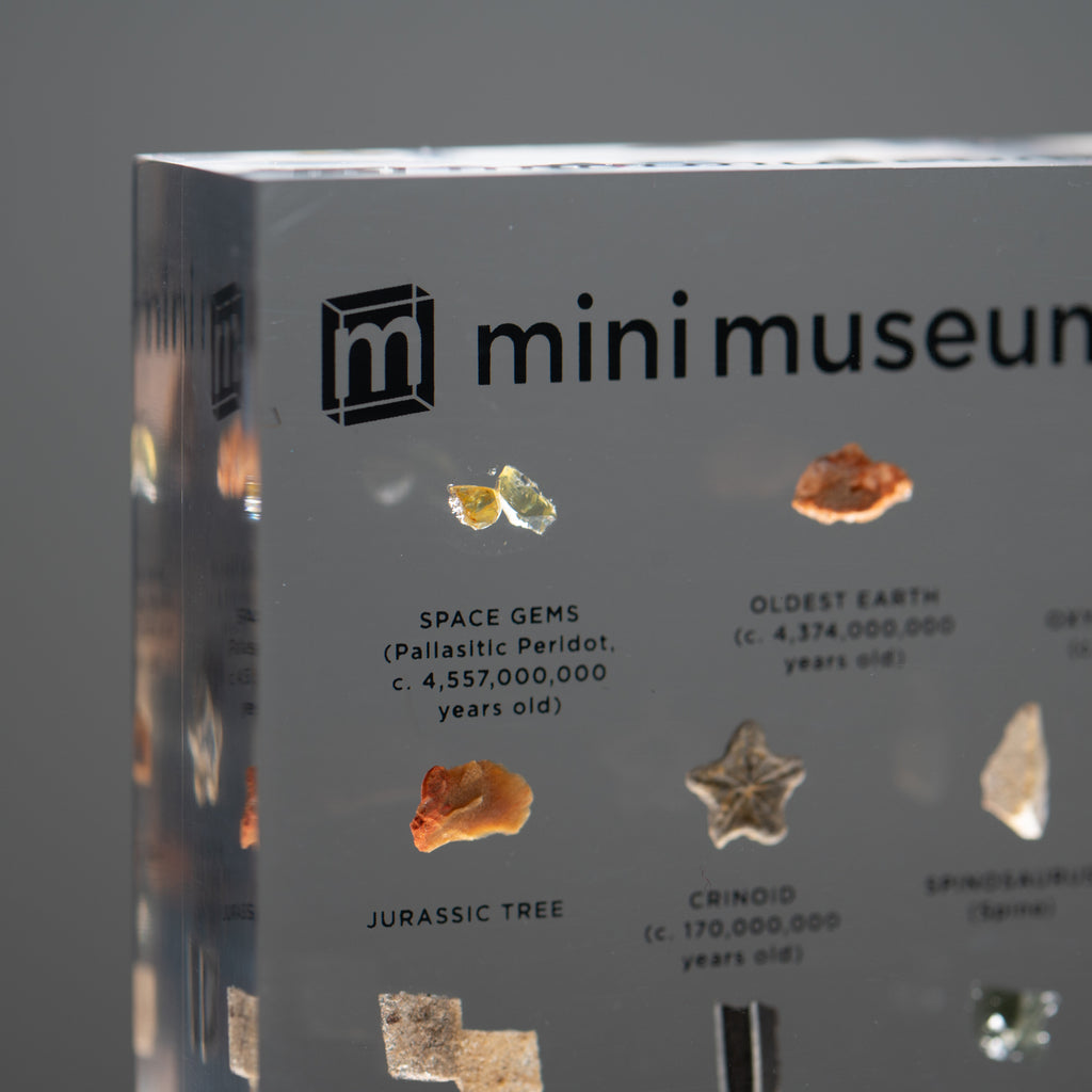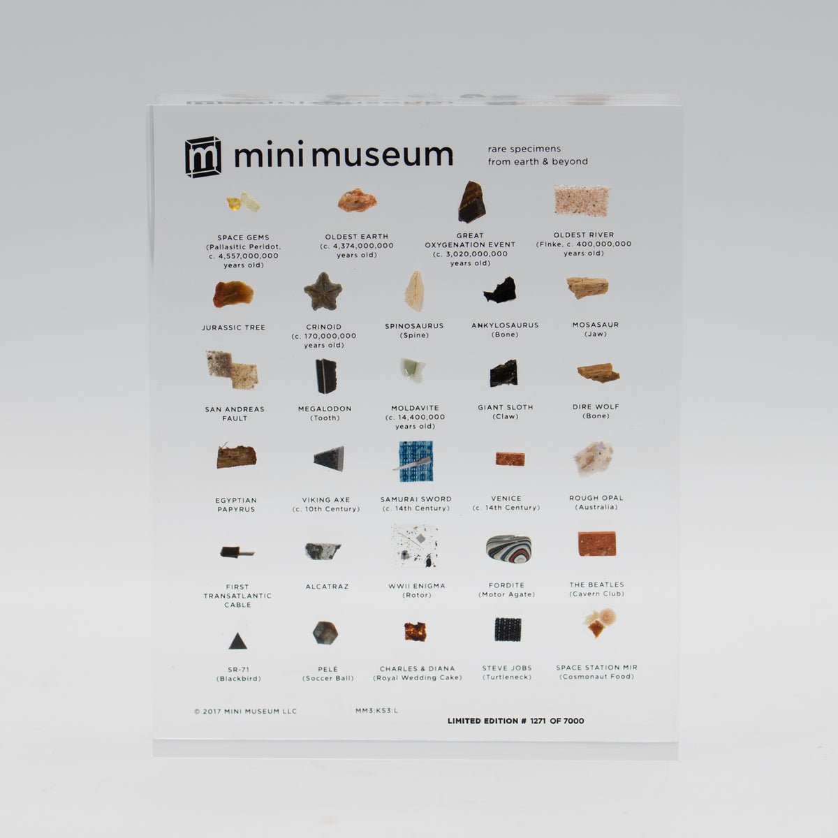 The Mini Museum is a handcrafted, limited edition collectible. The unique specimens are artfully arranged and clearly labeled. The entire collection is encased in Lucite acrylic and designed to inspire for generations.