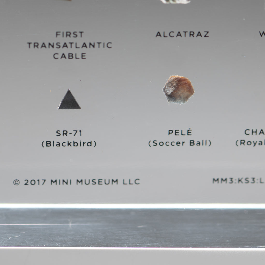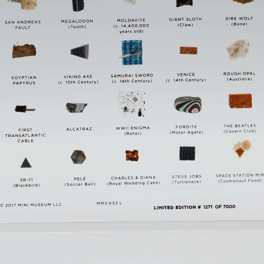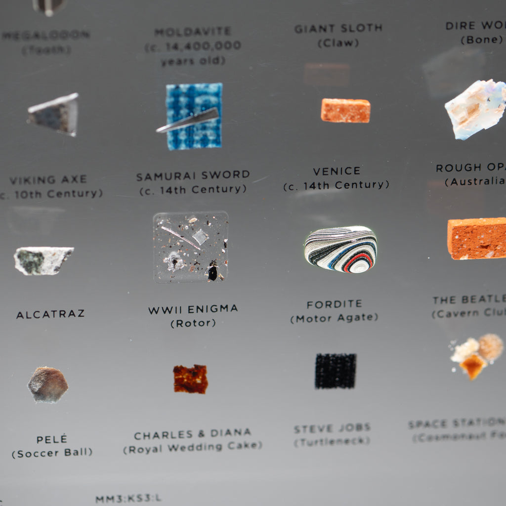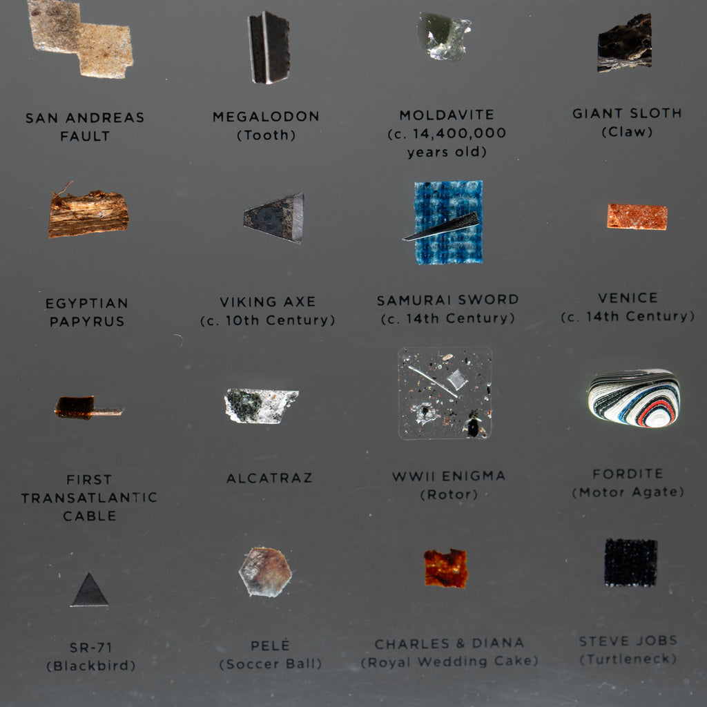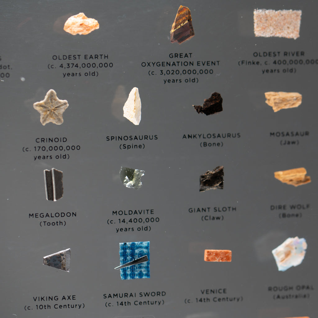 Space Gems, Oldest Earth, The Great Oxygen Event, Oldest River, Jurassic Tree, Crinoid, Spinosaurus Spine, Ankylosaurus Armor, The San Andreas Fault, Megalodon Tooth, Moldavite, Giant Sloth Claw, Dire Wolf, Egyptian Papyrus, Viking Axe, Samurai Sword, Venice Street Brick, Australian Rough Opal, First Transatlantic Cable, Alcatraz, WW II Enigma Machine Rotor, Fordite Motor Agate, The Beatles Cavern Club, SR-71 Blackbird, Pelé Soccer Ball, Charles & Diana's Royal Wedding Cake, Steve Jobs's Turtleneck (yes, really), Flown Cosmonaut Food from the Mir Space Station