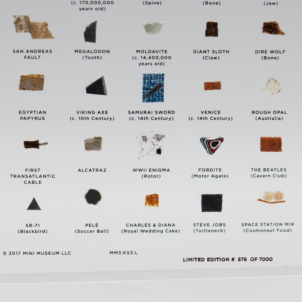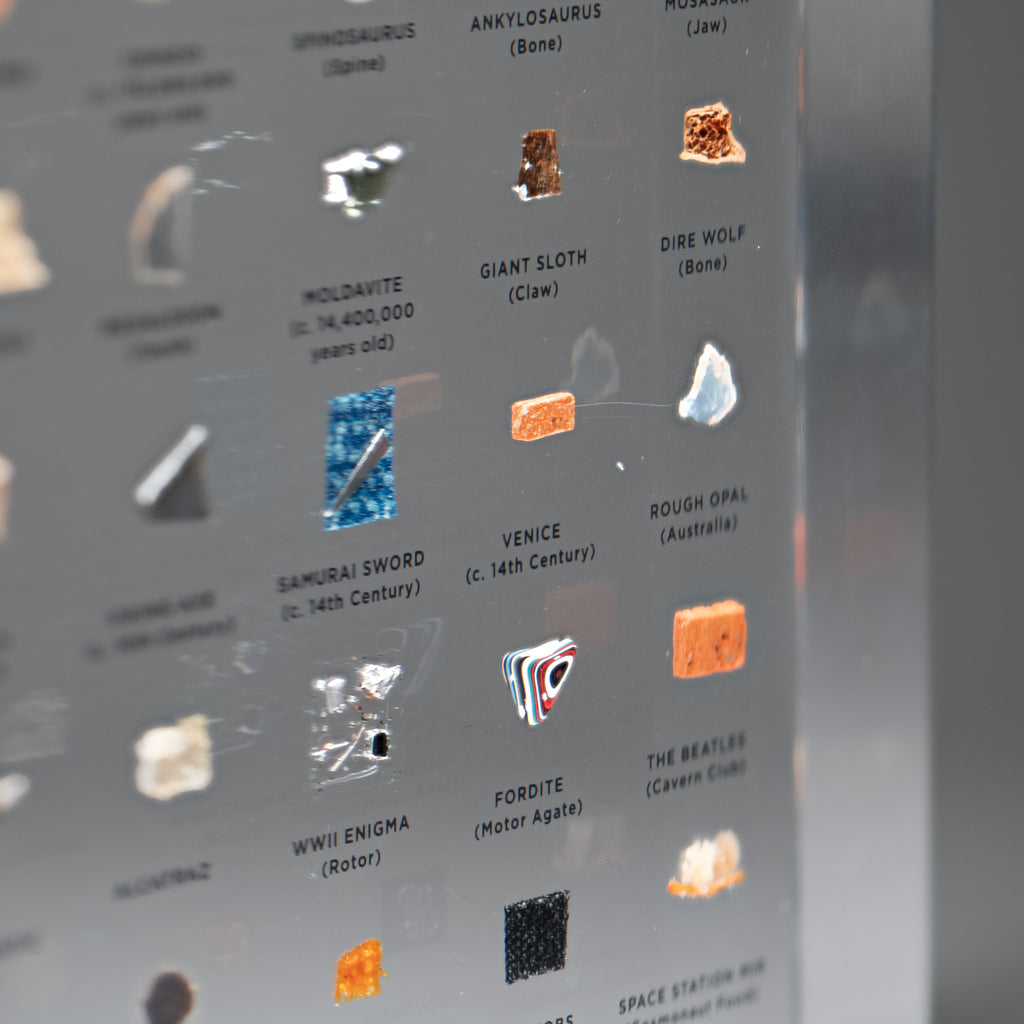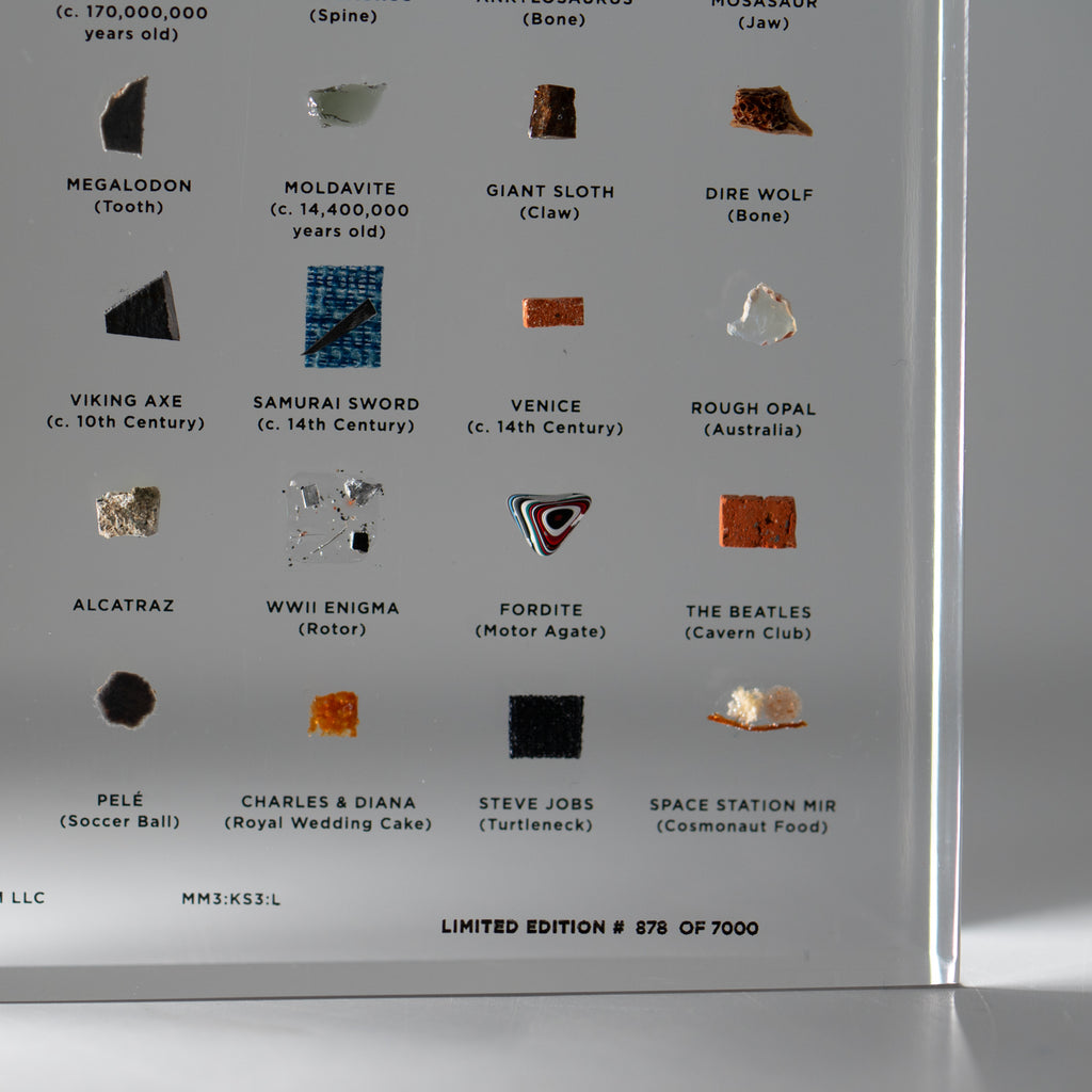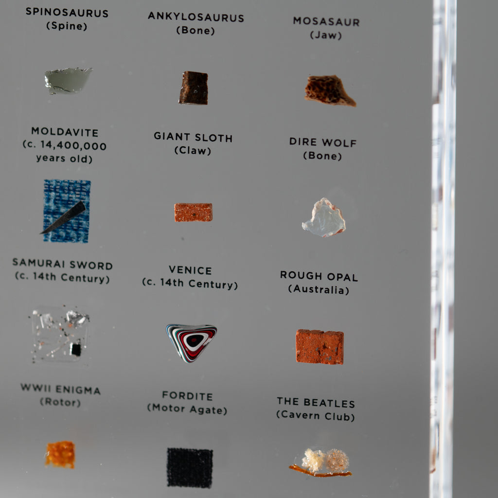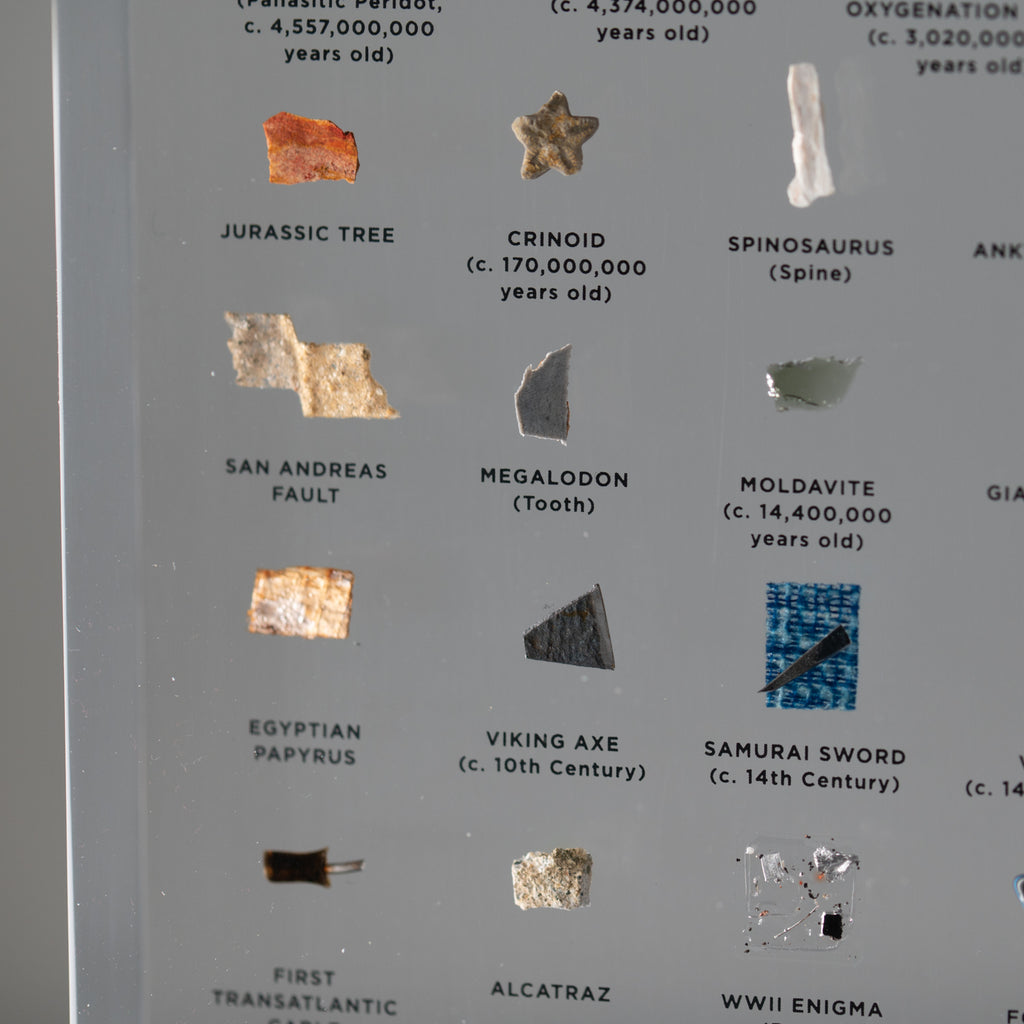 Space Gems, Oldest Earth, The Great Oxygen Event, Oldest River, Jurassic Tree, Crinoid, Spinosaurus Spine, Ankylosaurus Armor, The San Andreas Fault, Megalodon Tooth, Moldavite, Giant Sloth Claw, Dire Wolf, Egyptian Papyrus, Viking Axe, Samurai Sword, Venice Street Brick, Australian Rough Opal, First Transatlantic Cable, Alcatraz, WW II Enigma Machine Rotor, Fordite Motor Agate, The Beatles Cavern Club, SR-71 Blackbird, Pelé Soccer Ball, Charles & Diana's Royal Wedding Cake, Steve Jobs's Turtleneck (yes, really), Flown Cosmonaut Food from the Mir Space Station