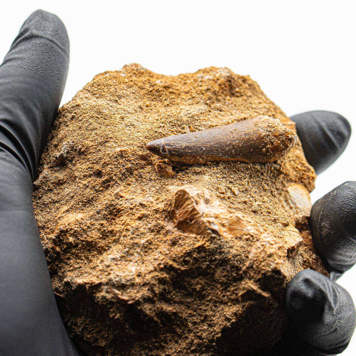This specimen is a Plesiosaur tooth embedded in matrix. It was recovered from deposits in Morocco and dates to the Late Cretaceous Period.