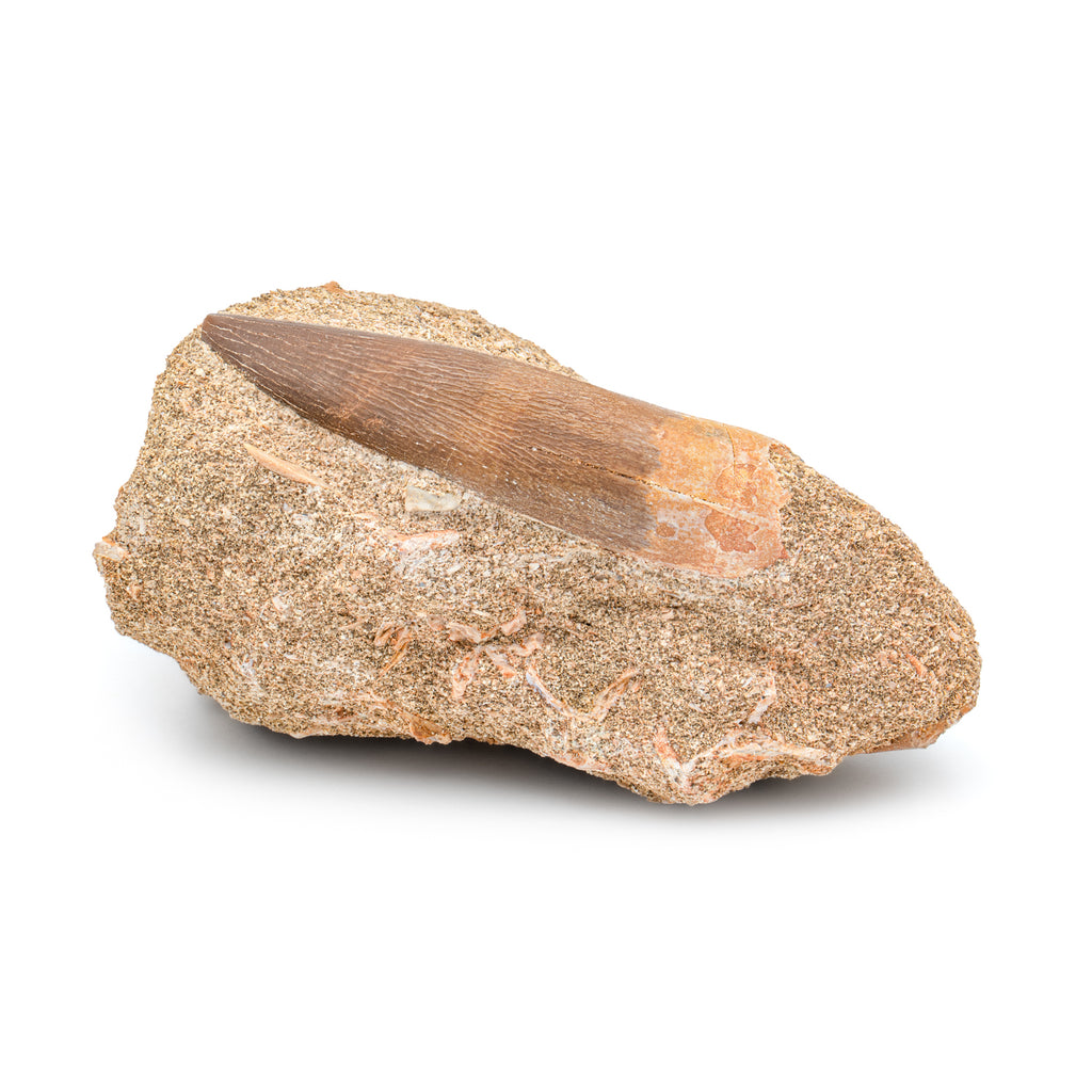 This specimen is a Plesiosaur tooth embedded in matrix. It was recovered from deposits in Morocco and dates to the Late Cretaceous Period.