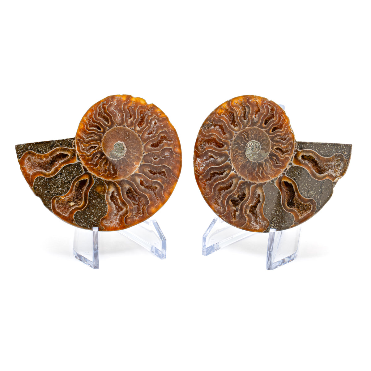 These internal chambers are called septa and the ammonite could fill them with air in order to float through the ocean like a balloon. After millions of years, they are now mineralized with beautiful spiral patterns. A pair of stands and informational card is included the fossil.
