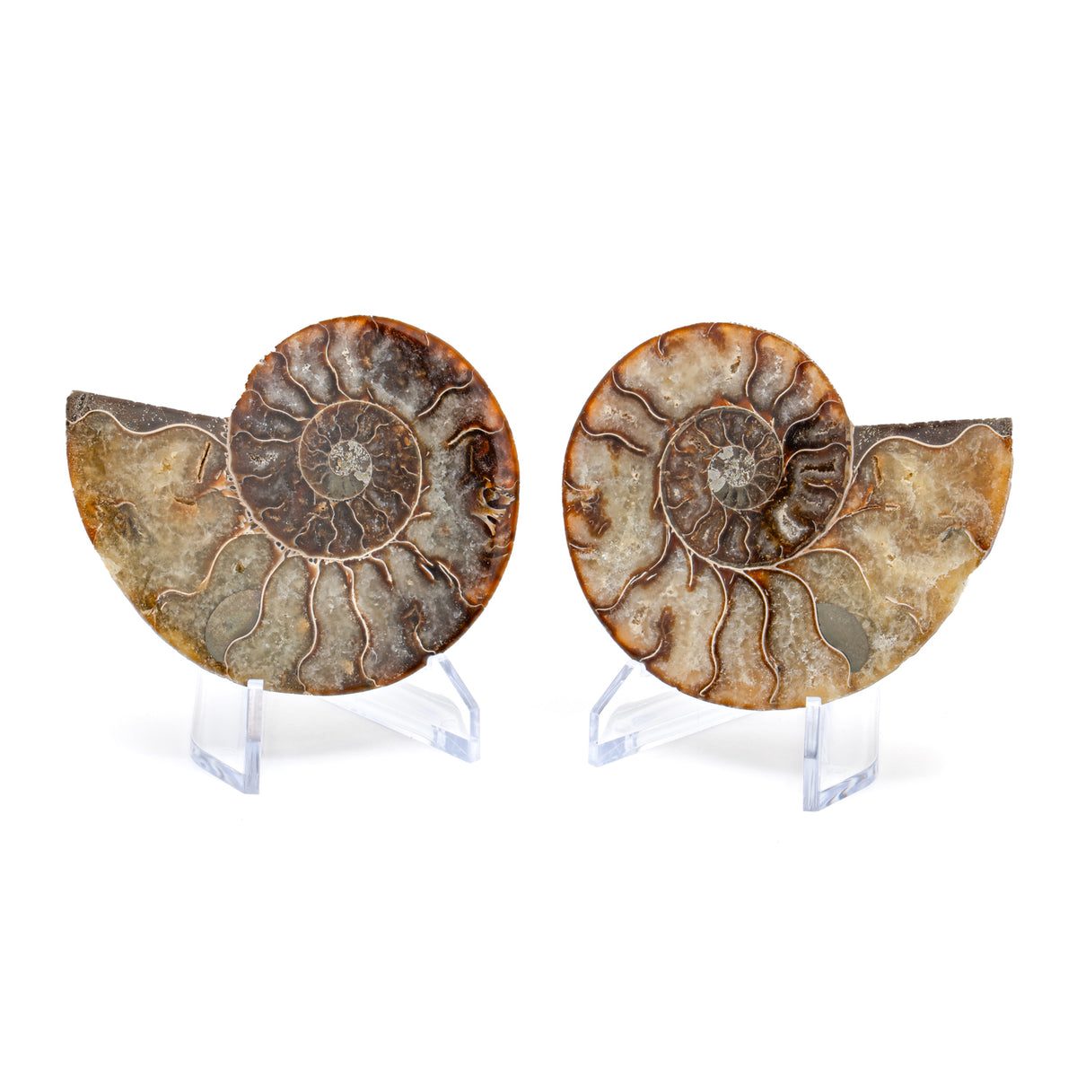 These Split Ammonites are pairs and comes with two stands for display. A small informational card that serves as certificate of authenticity is also included.