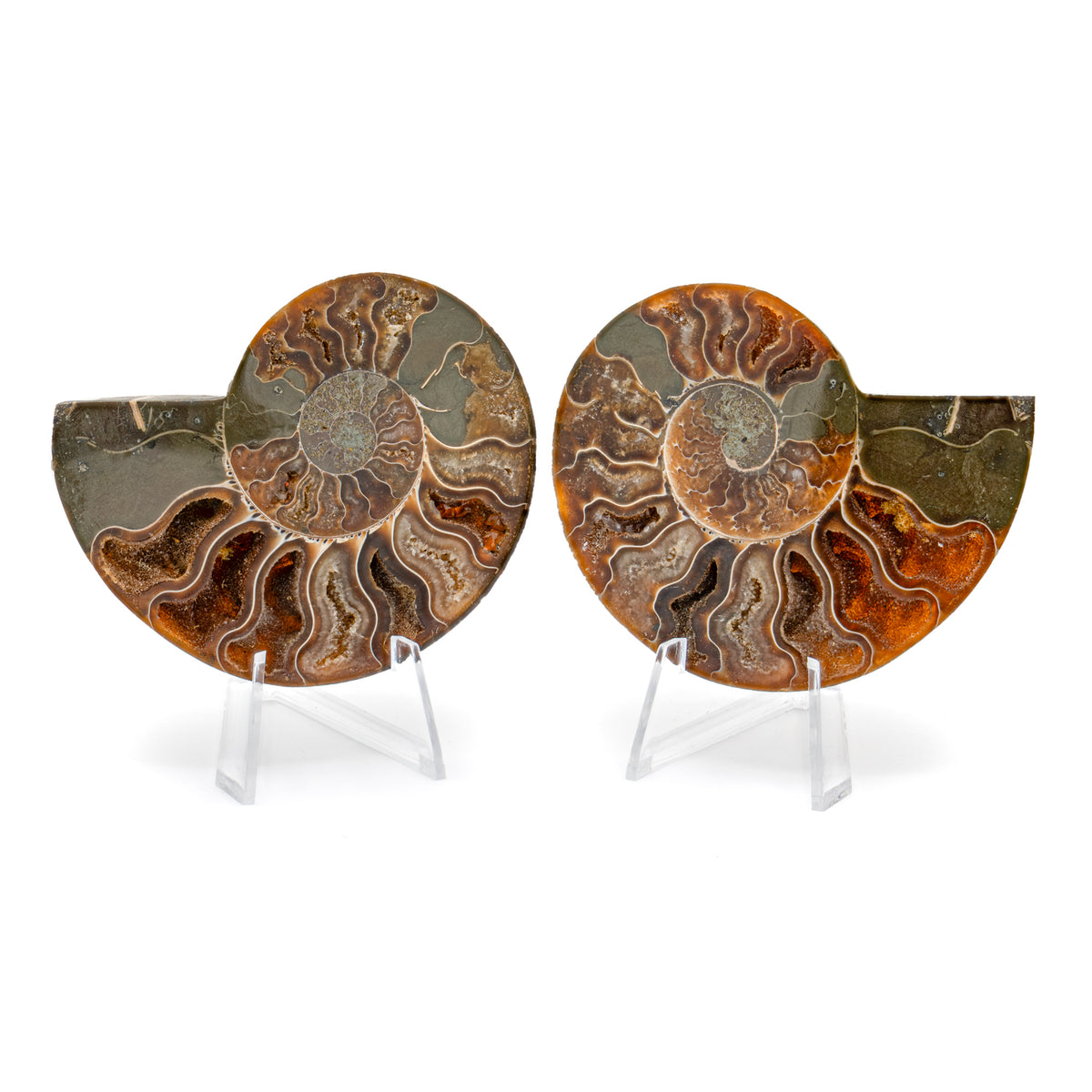 These Split Ammonites are pairs and comes with two stands for display. A small informational card that serves as certificate of authenticity is also included.