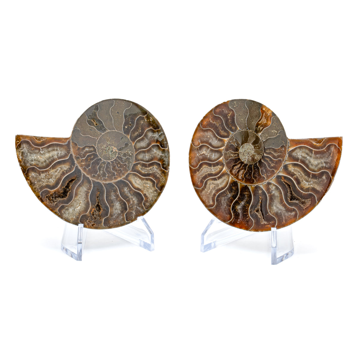 Ammonites are an extinct group of cephalopods that entered the fossil record 400 million years ago. This specimen is a 3.608" polished Cleoniceras fossil from Madagascar. The fossil has been split into a paired set to showcase the beautiful internal chambers of the shell.