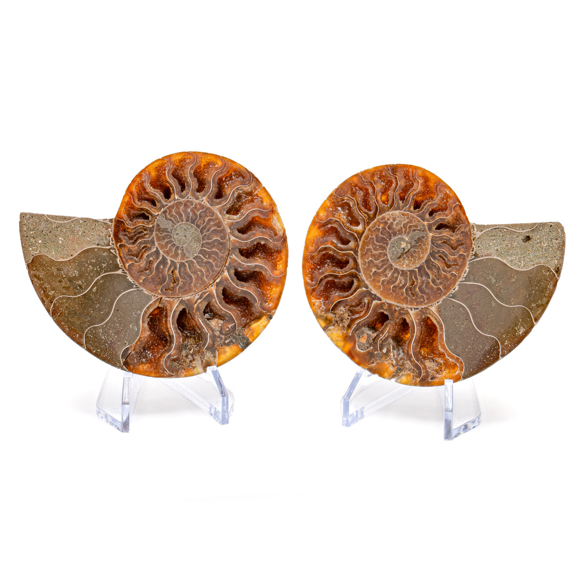 These Split Ammonites are pairs and comes with two stands for display. A small informational card that serves as certificate of authenticity is also included.