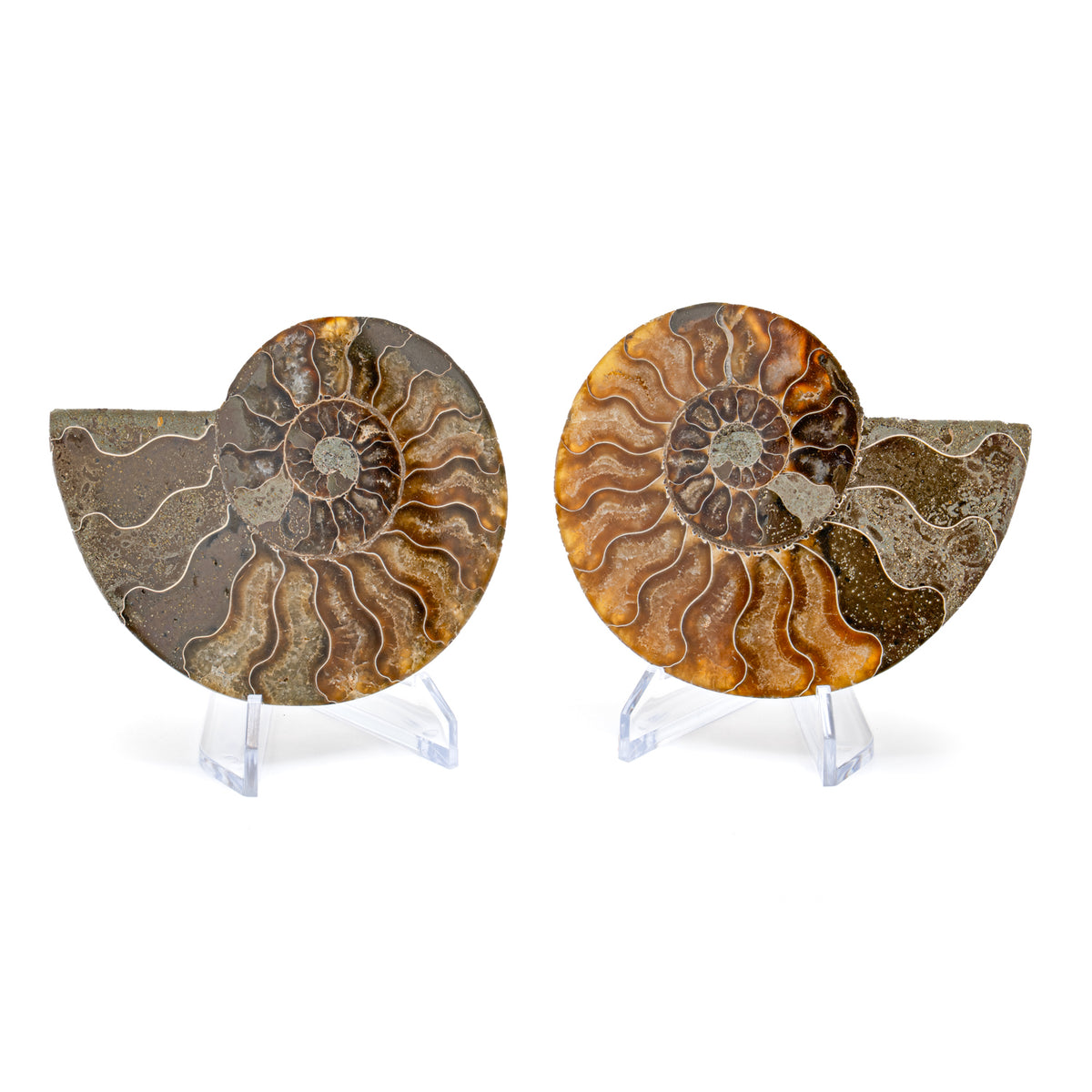 These Split Ammonites are pairs and comes with two stands for display. A small informational card that serves as certificate of authenticity is also included.