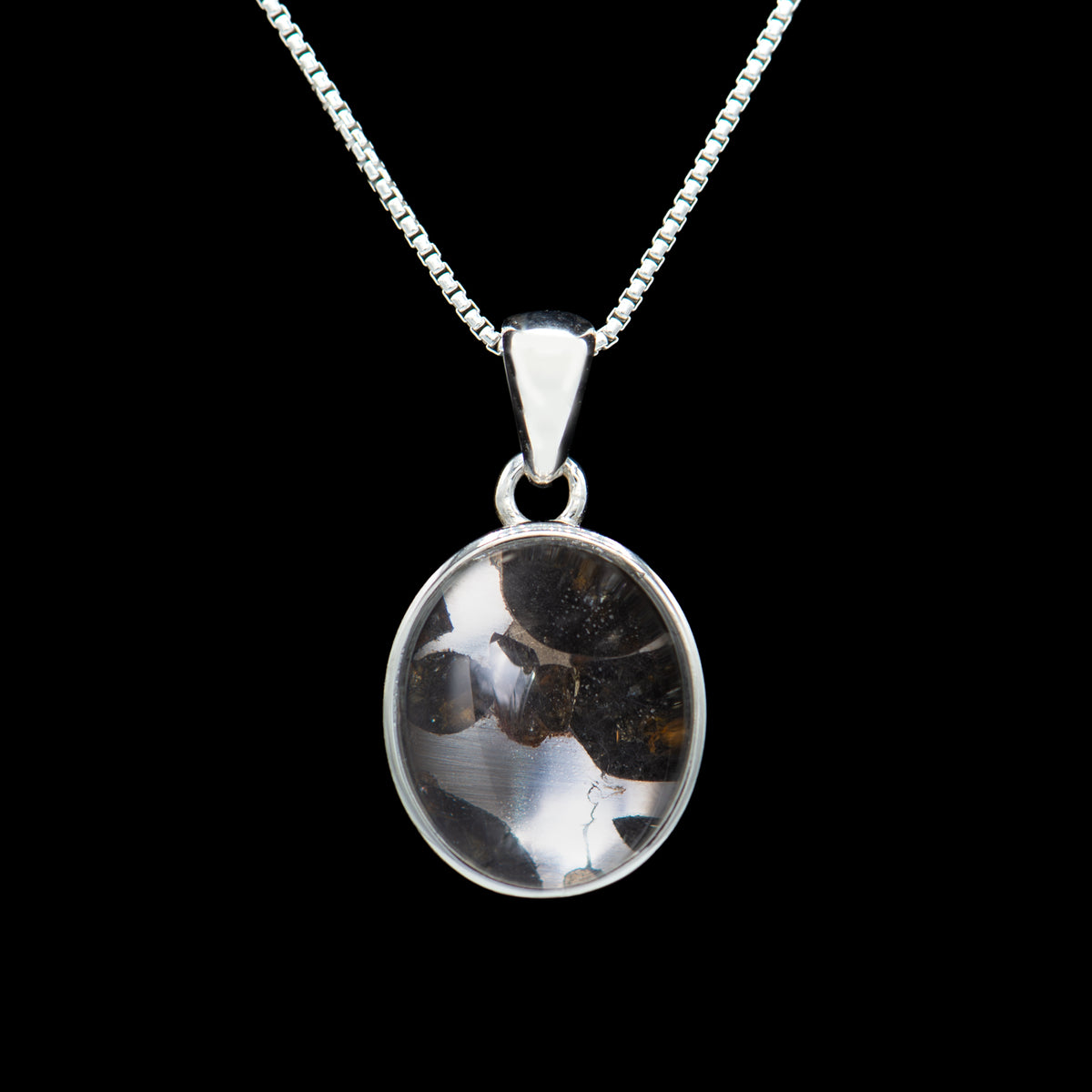This pendant features a fragment of the Sericho Pallasite meteorite set in sterling silver with a box-style chain. It is presented with a handsome display case and certificate of authenticity.