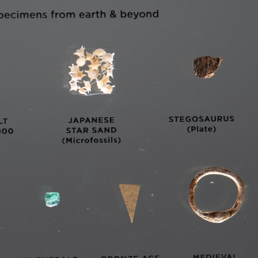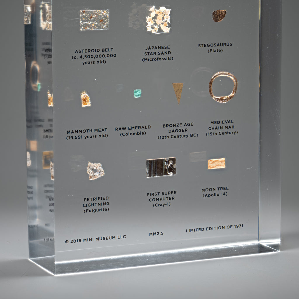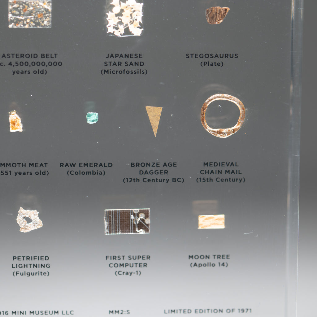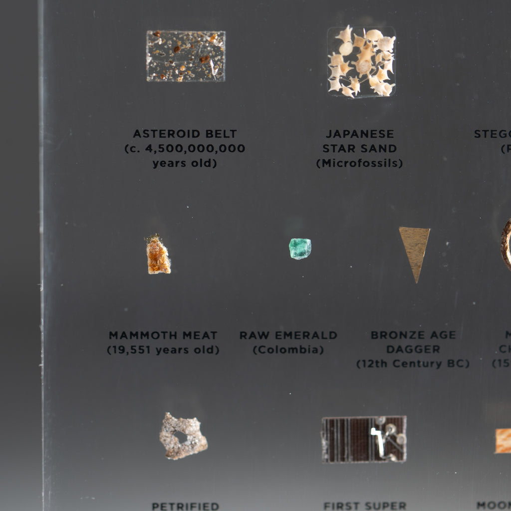 The Asteroid Belt (c. 4,500,000,000 Years Old), Japanese Star Sand (Foraminafera Microfossils), Stegosaurus Plate, Mammoth Meat (19,551 Years Old), Raw Emerald from Colombia, Bronze Age Dagger from the 12th Century BCE, Medieval Chain Mail from the 15th Century CE, Petrified Lightning (Fulgurite), the First Super Computer (Cray-1), and Moon Tree from Apollo 14