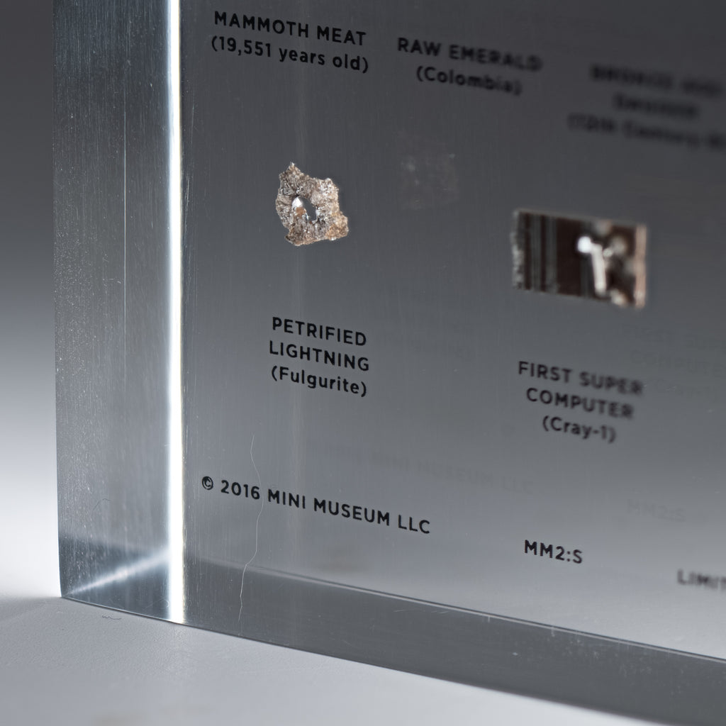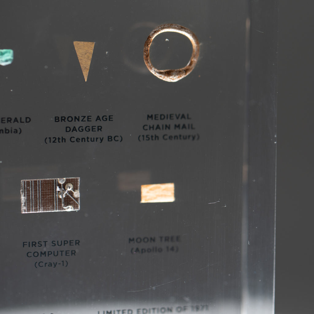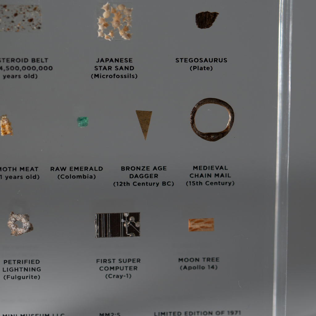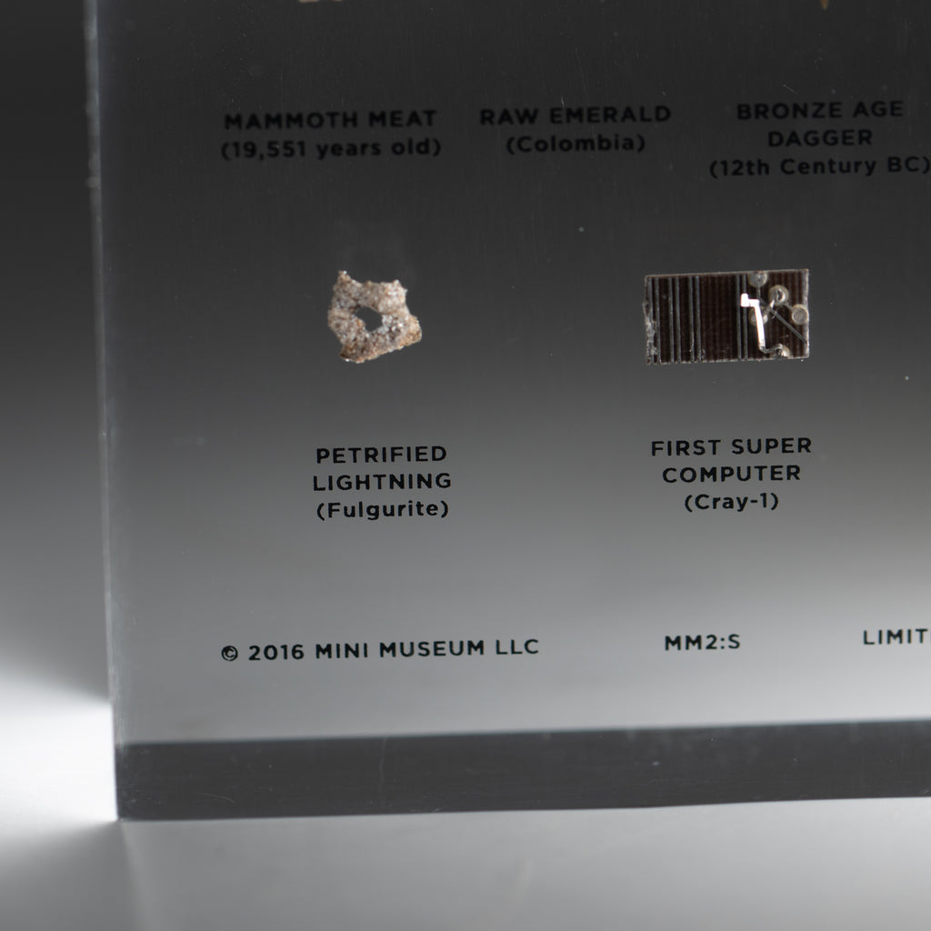 The Asteroid Belt (c. 4,500,000,000 Years Old), Japanese Star Sand (Foraminafera Microfossils), Stegosaurus Plate, Mammoth Meat (19,551 Years Old), Raw Emerald from Colombia, Bronze Age Dagger from the 12th Century BCE, Medieval Chain Mail from the 15th Century CE, Petrified Lightning (Fulgurite), the First Super Computer (Cray-1), and Moon Tree from Apollo 14