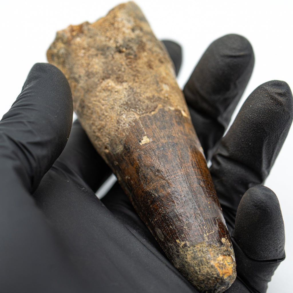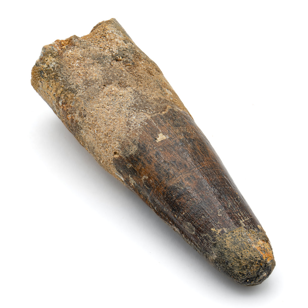 This specimen is a naturally worn crown and partial root of a real, fossilized Spinosaurus tooth from the Kem Kem fossil beds of Morocco. It measures 3.809" in length.