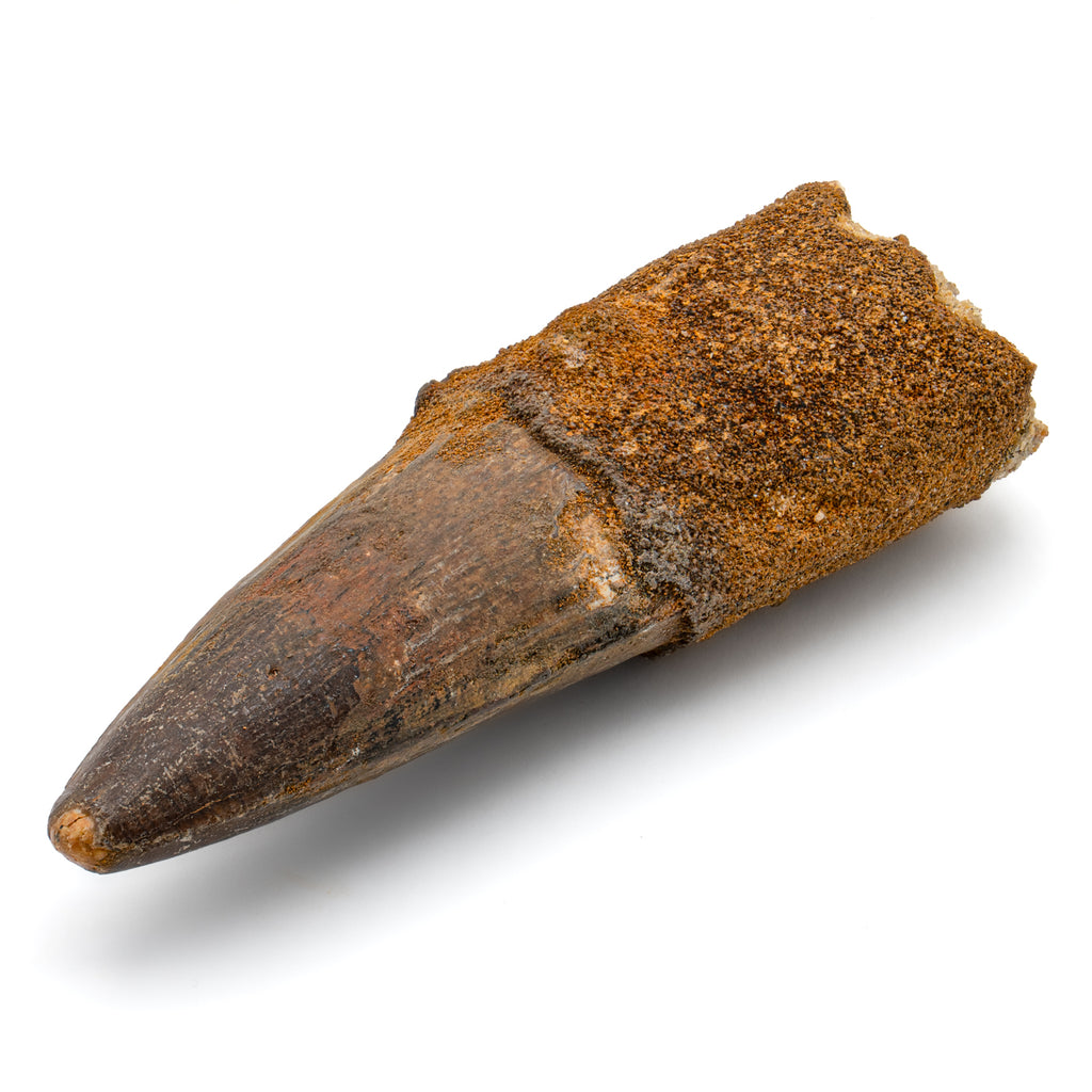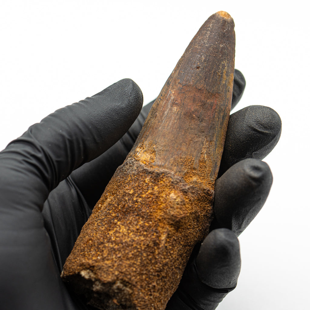 This specimen is a naturally worn crown and partial root of a real, fossilized Spinosaurus tooth from the Kem Kem fossil beds of Morocco. It measures 4.015" in length.