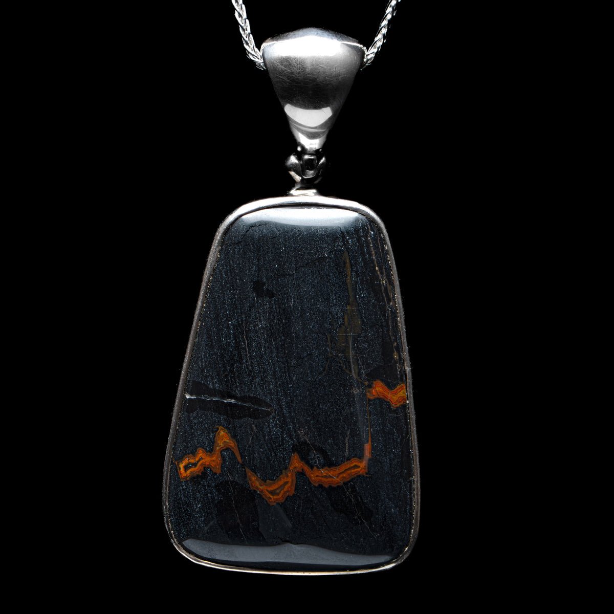 These pendants capture the incredible history of the fossil with volcanic dark grays and bursts of brilliant reds and yellows. Each is crafted with a polished piece of fossil wood set into a sterling silver bezel. An 18" chain is also included, along with a black padded storage case and informational authenticity card.