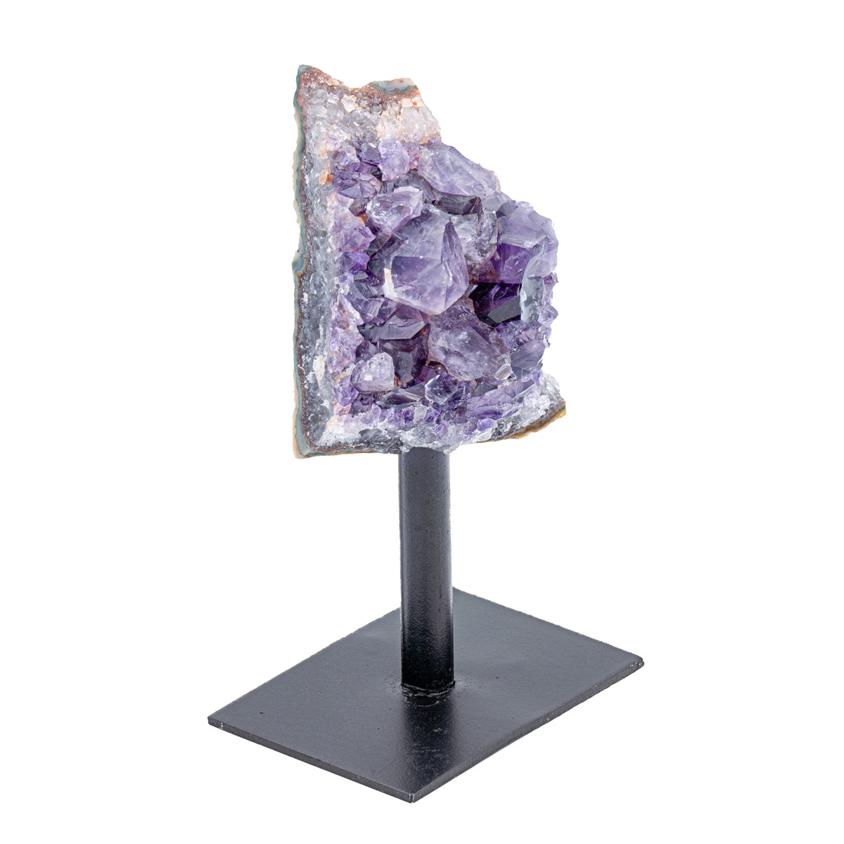 Each amethyst cluster comes mounted on a classic black metal stand with a sturdy base. Each cluster is a completely unique arrangement of crystals from a different geode. All are beautifully unique and show outstanding purple coloration.