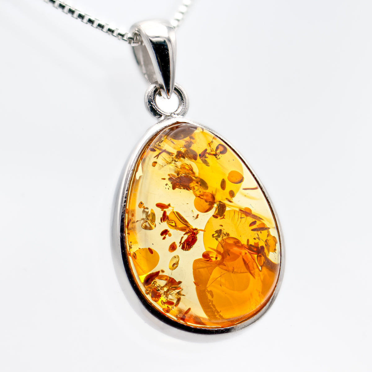 This necklace is made from a teardrop bead of Baltic amber. The exact size and inclusions of each necklace can vary. You can see the exact sizing and look of this showcase jewelry piece above.
