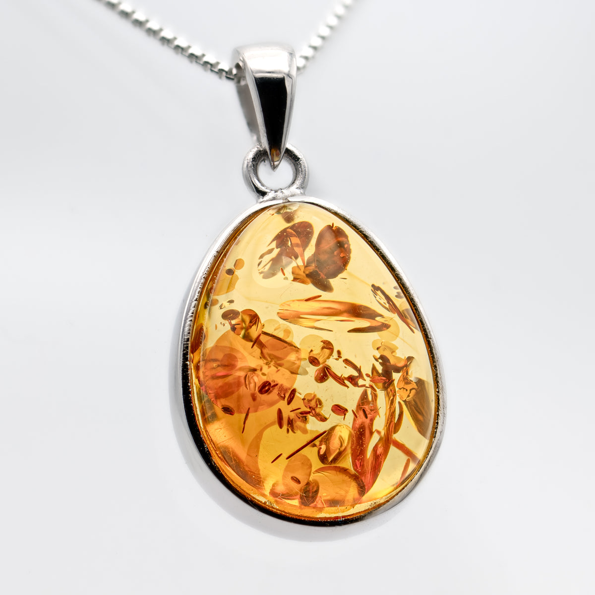 This necklace is made from a teardrop bead of Baltic amber. The exact size and inclusions of each necklace can vary. You can see the exact sizing and look of this showcase jewelry piece above.